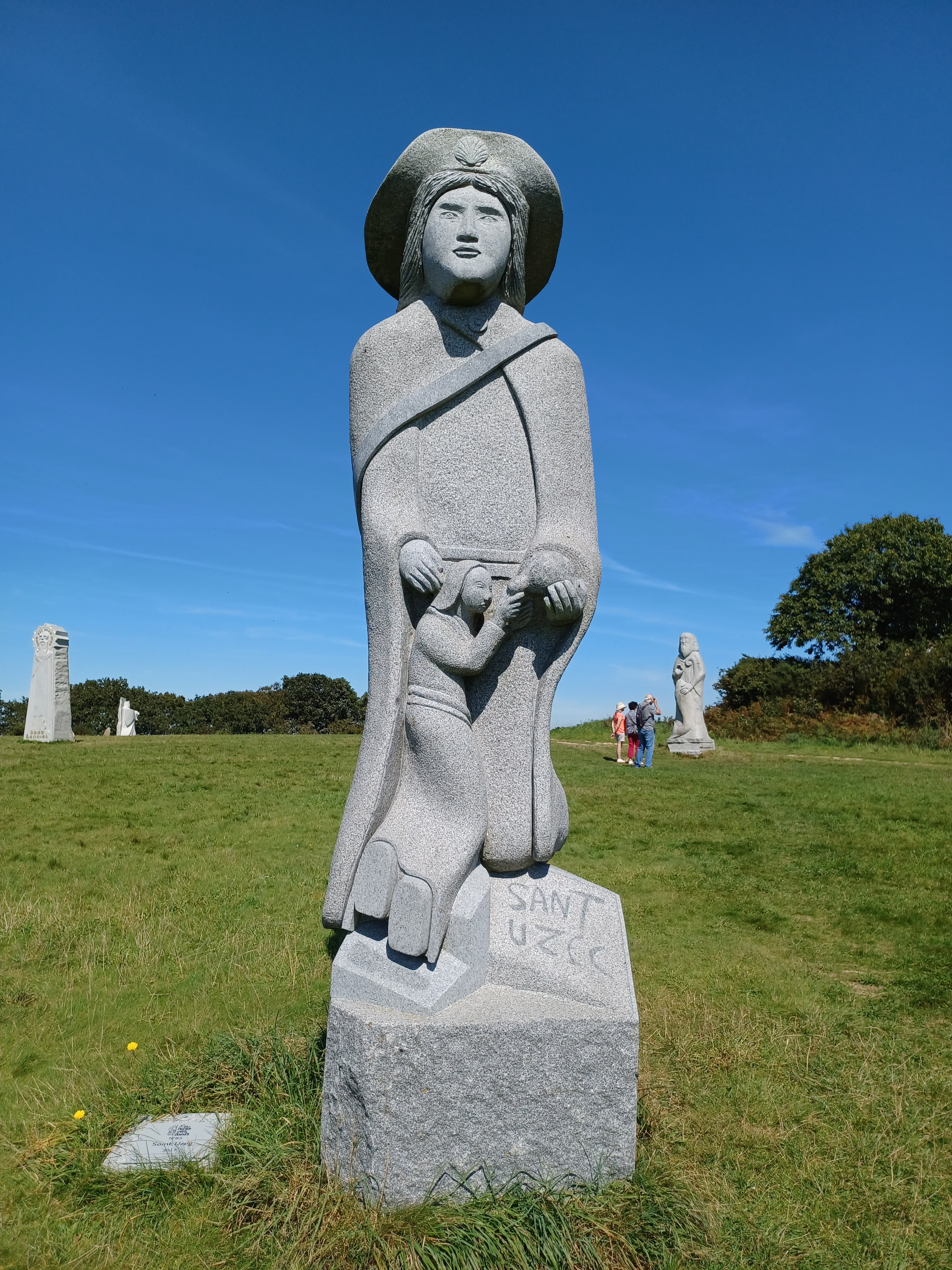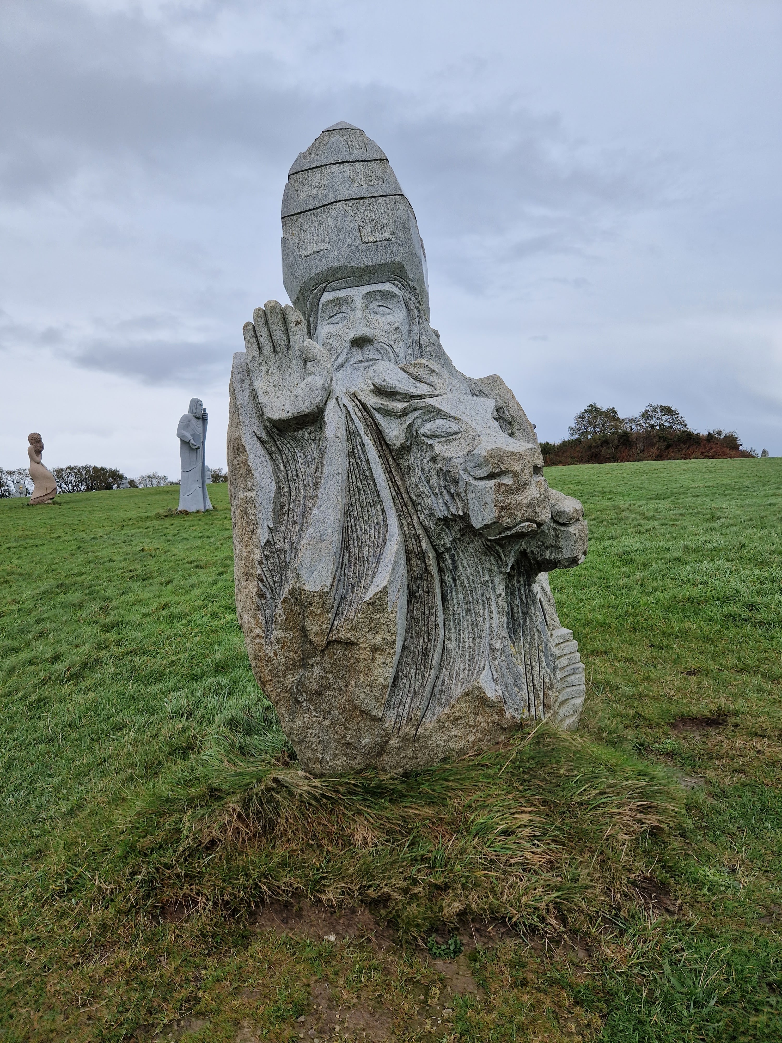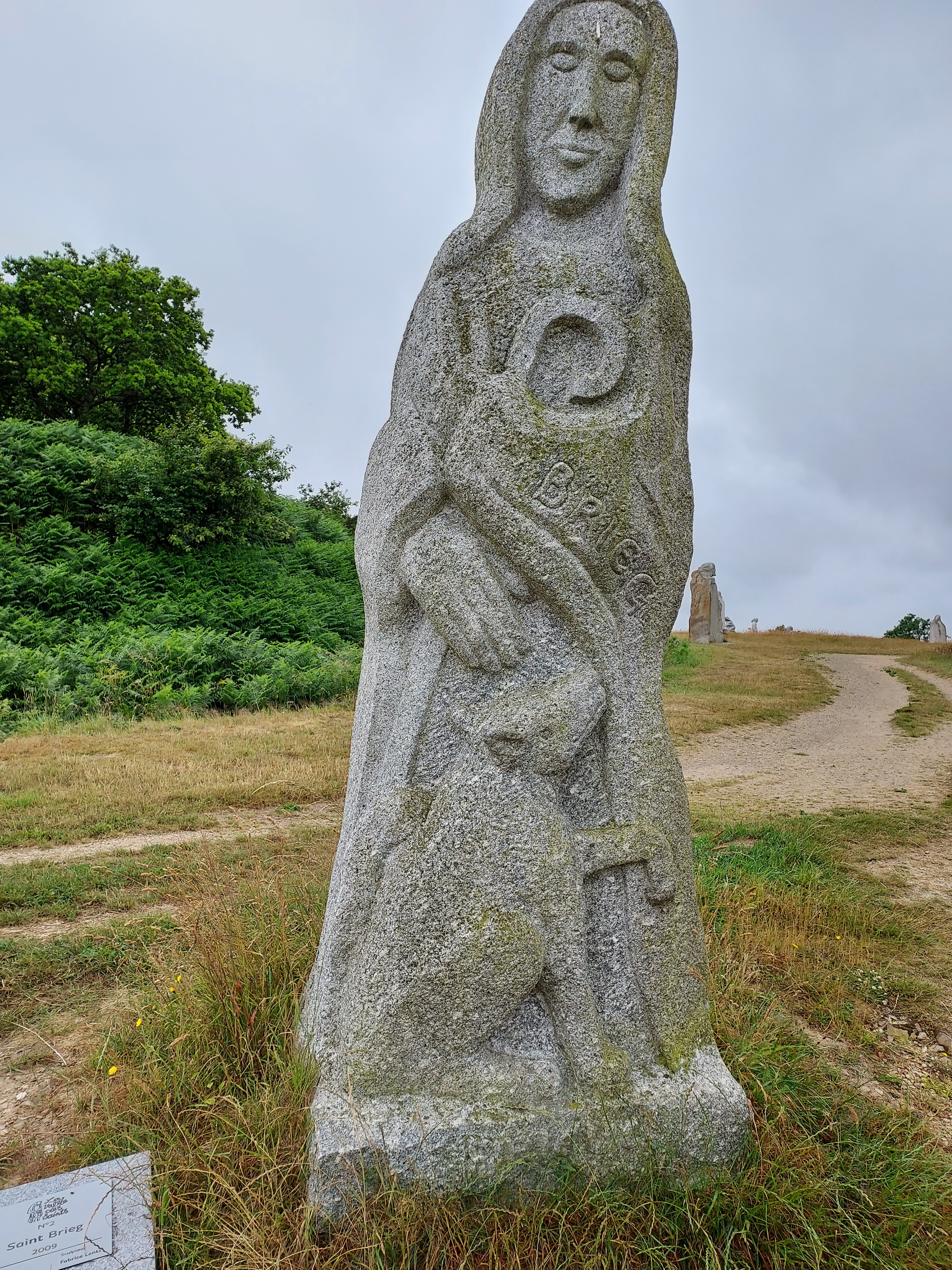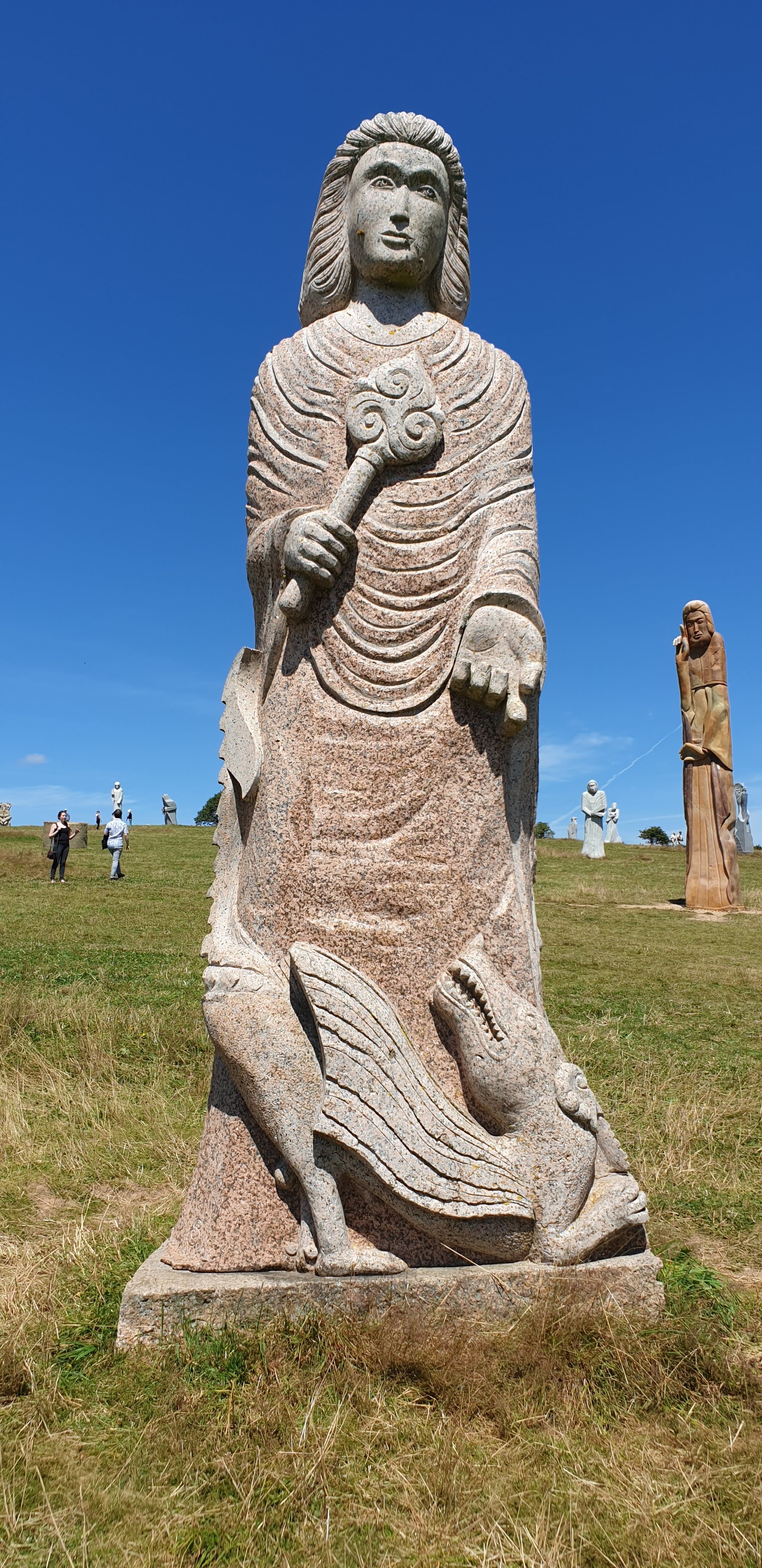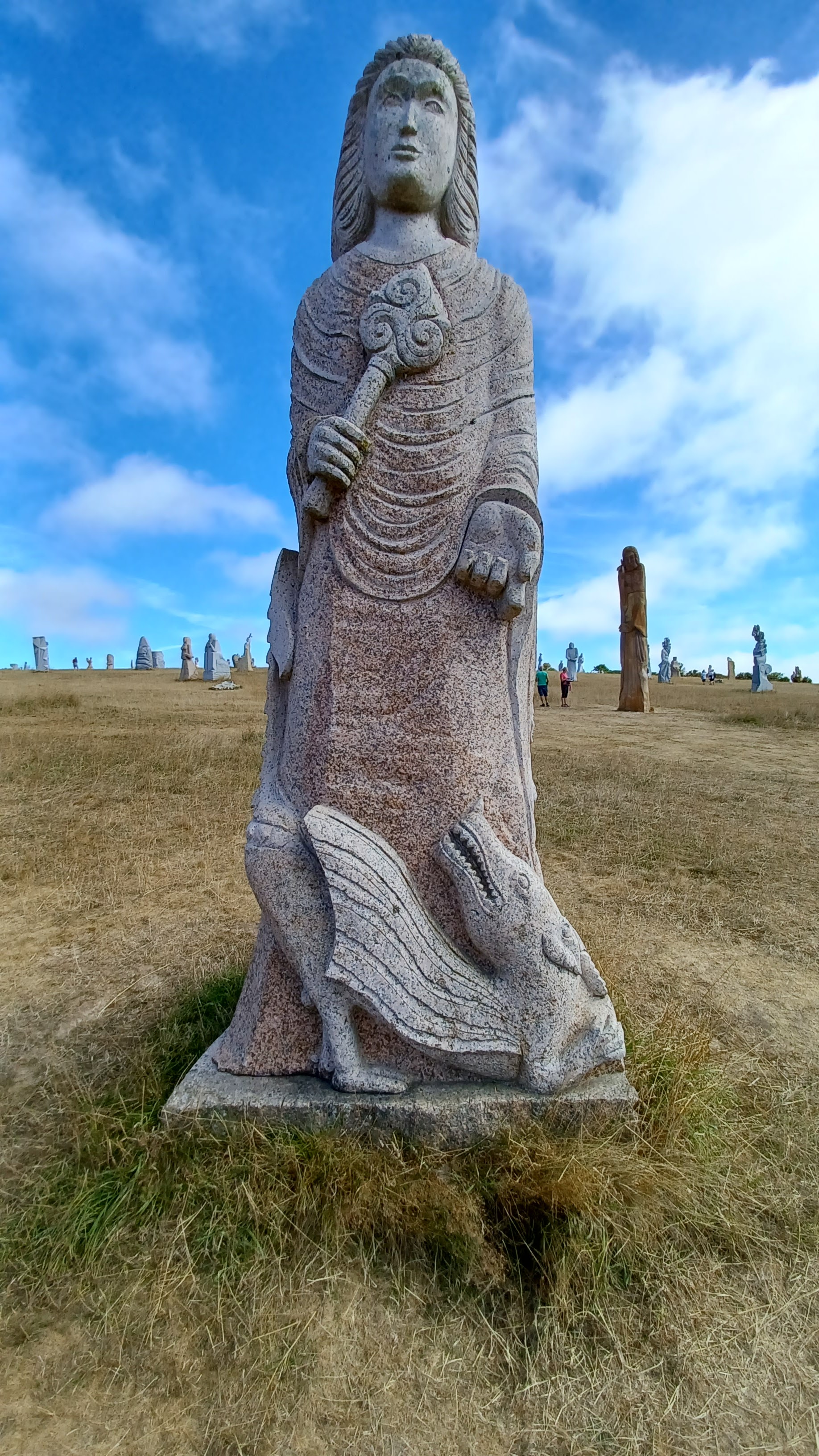 De Sainte-Anne à Saint-Yves, ils sont déjà nombreux les saints bretons à avoir leur statues dans la Vallée des Saints à Carnoët. A terme, ce site, où le granit breton est à l'honneur, devrait accueillir environ 1000 statues. Mi 2023, la vallée accueille 178 statues géantes. Des visites guidées sont organisées. Elles sont très intéressantes. Je vous conseille de choisir cette option, si vous en avez la possibilité. Il ne s'agit pas de faire le tour de toutes les statues. Le but est de vous donner les clés d'interprétation des attributs des statues : exemple le septre et le poisson pour Saint-Corentin, évêque de Quimper, qui pêchait et mangeait un morceau du même poisson miraculeux chaque jour. Un livret, vendu en kiosque, associé à une application audio-guide sur smartphone, permet d'avoir toutes les infos sur chaque saint. Un site exceptionnel, une idée très originale au service de la culture populaire bretonne. A voir absolument, si vous aimez la Bretagne et la culture bretonne. Espace pique-nique et petite restauration sur place. Grand parking à proximité.