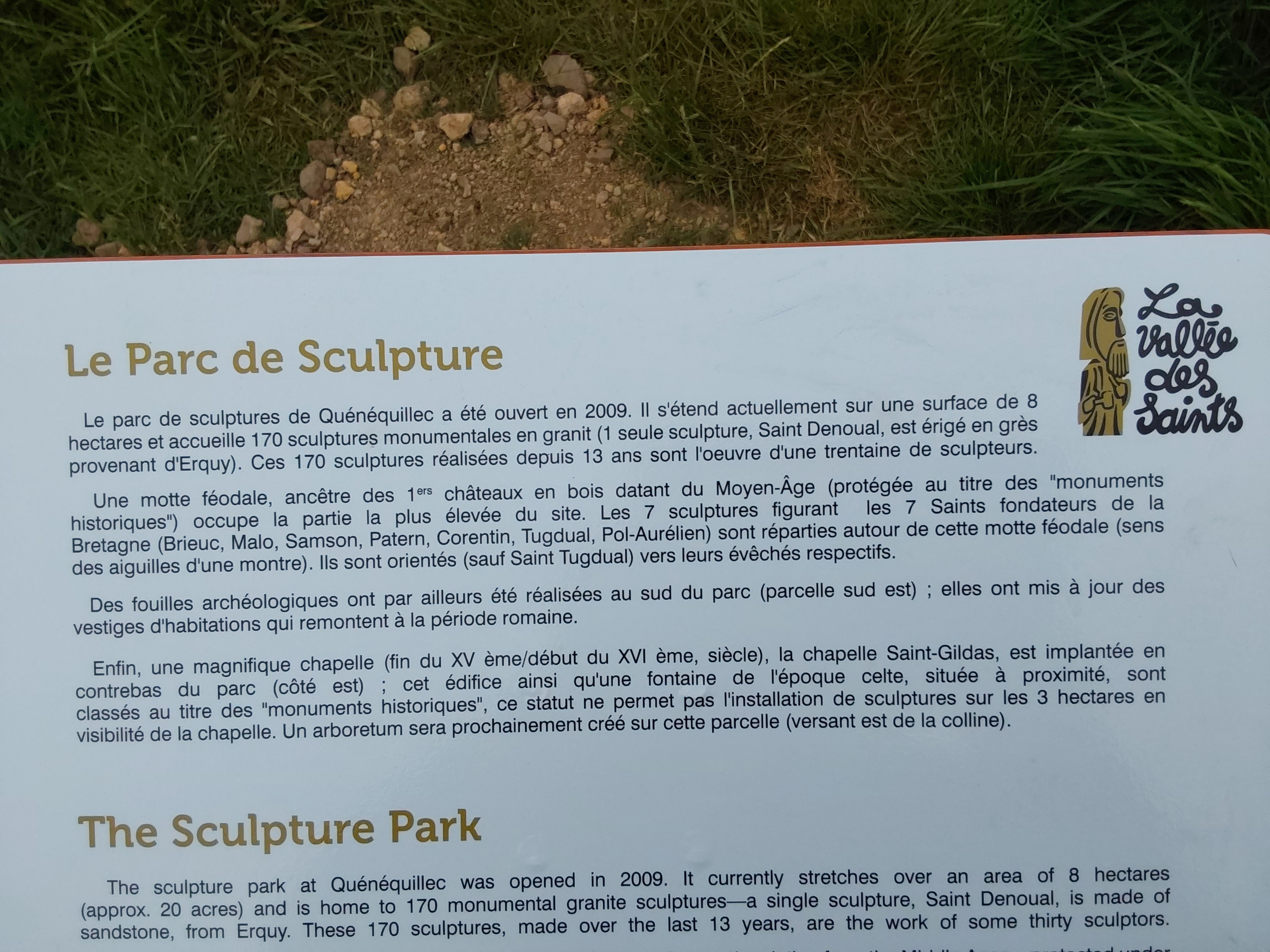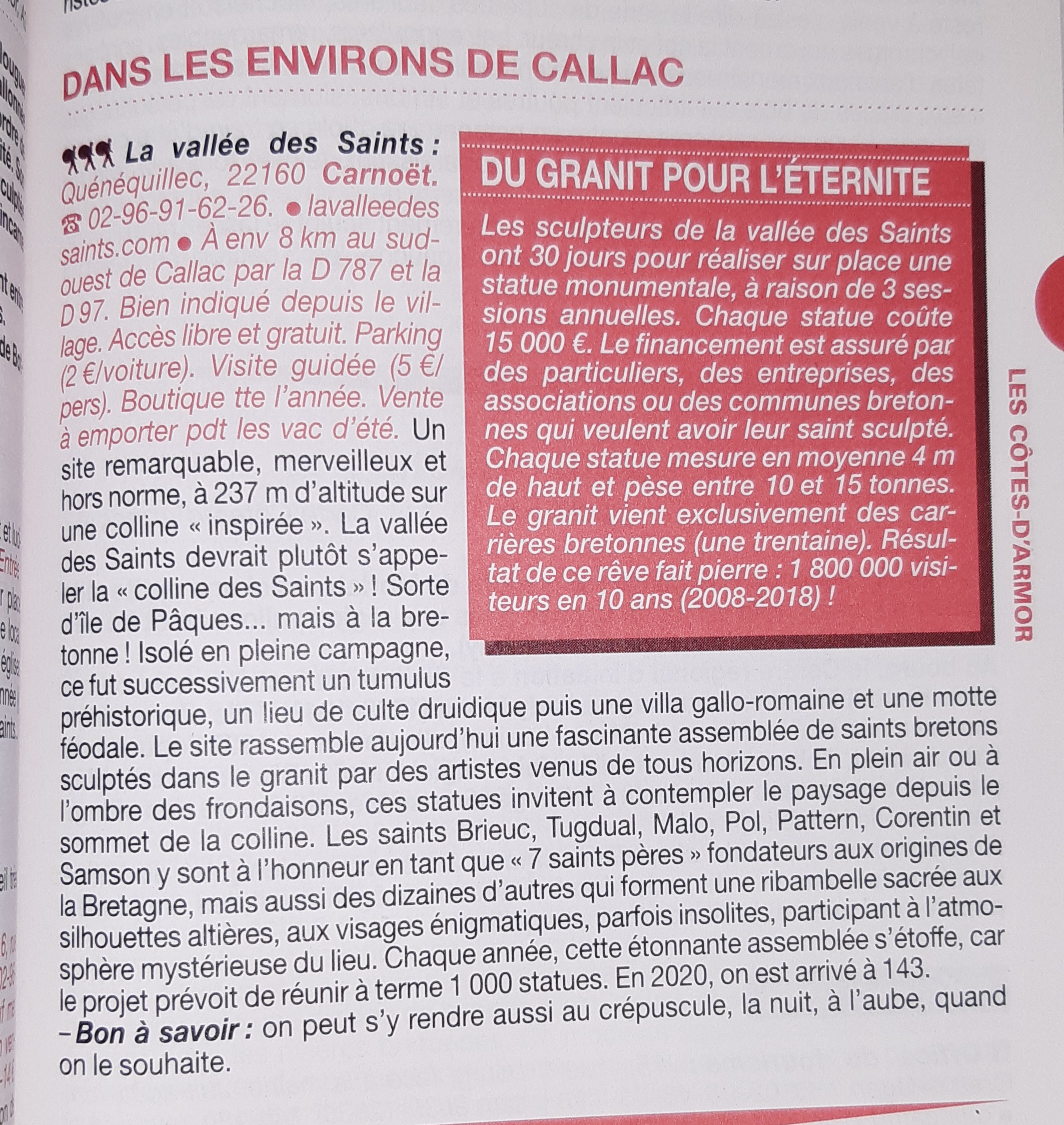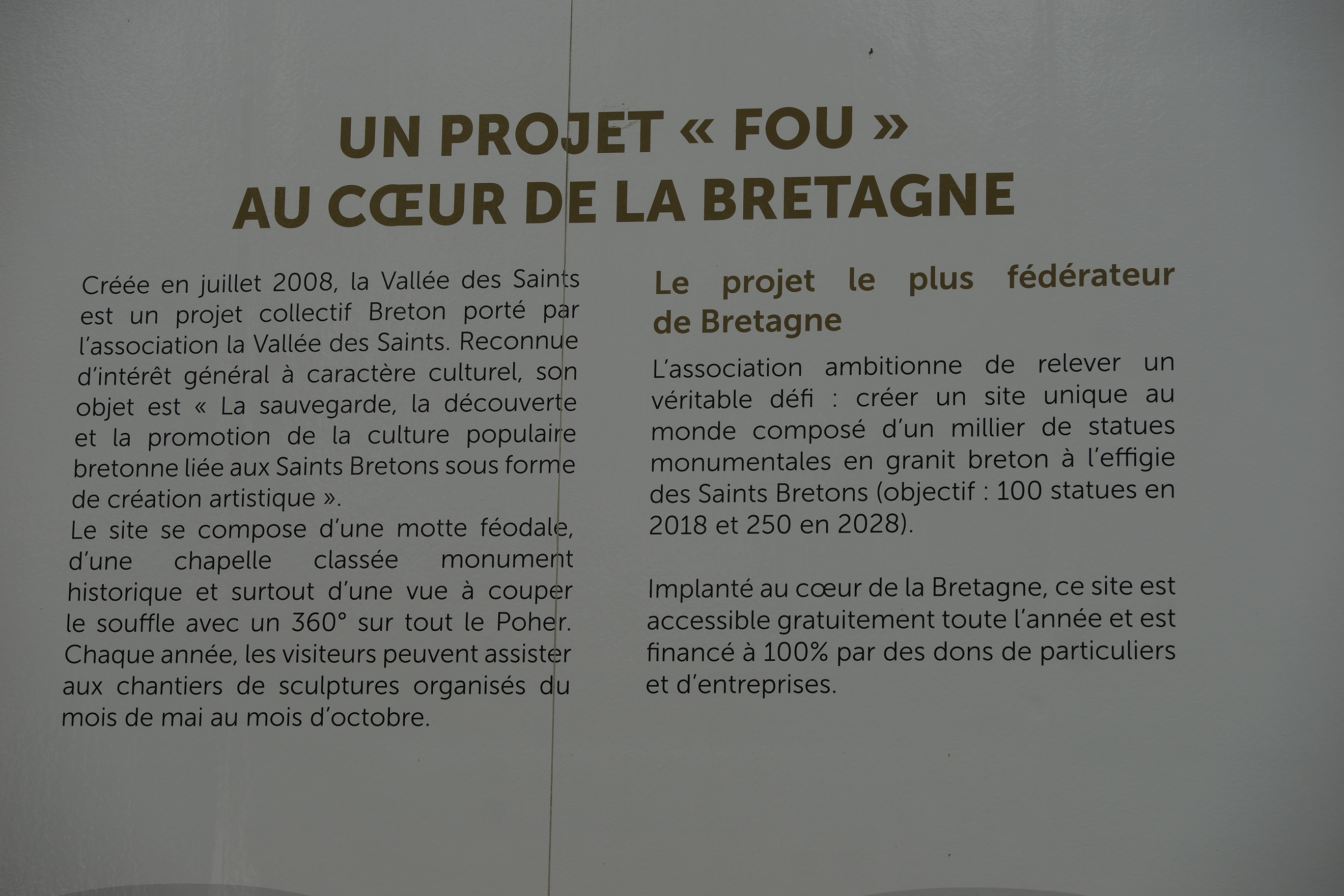 Un endroit extraordinaire en pleine campagne où plus d'une centaine de statues géantes de granit, représentant les multiples saints bretons, parsèment une prairie de plusieurs hectares, dominée par les vestiges d'une motte féodale. On peut passer plusieurs heures avant d'en avoir fait le tour, surtout si on cherche les petits détails cachés sur chaque statue. L'accès est gratuit et illimité, le parking (tout neuf) est payant. On peut regretter l'absence de panneaux explicatifs, avec quelques détails sur chaque saint ou sur les choix de chaque sculpteur, mais cela viendra peut-être un jour puisque la vallée est en constante évolution.