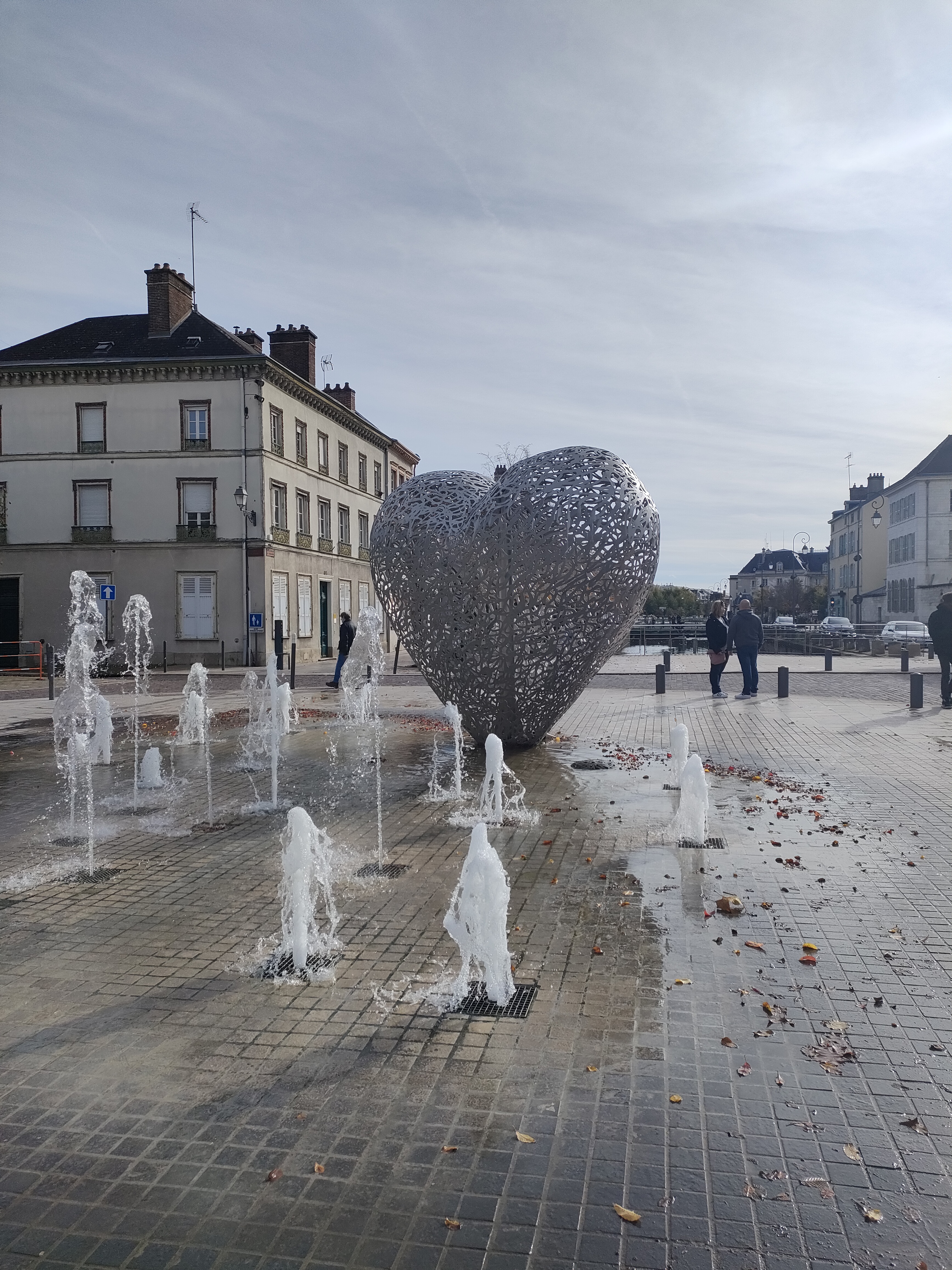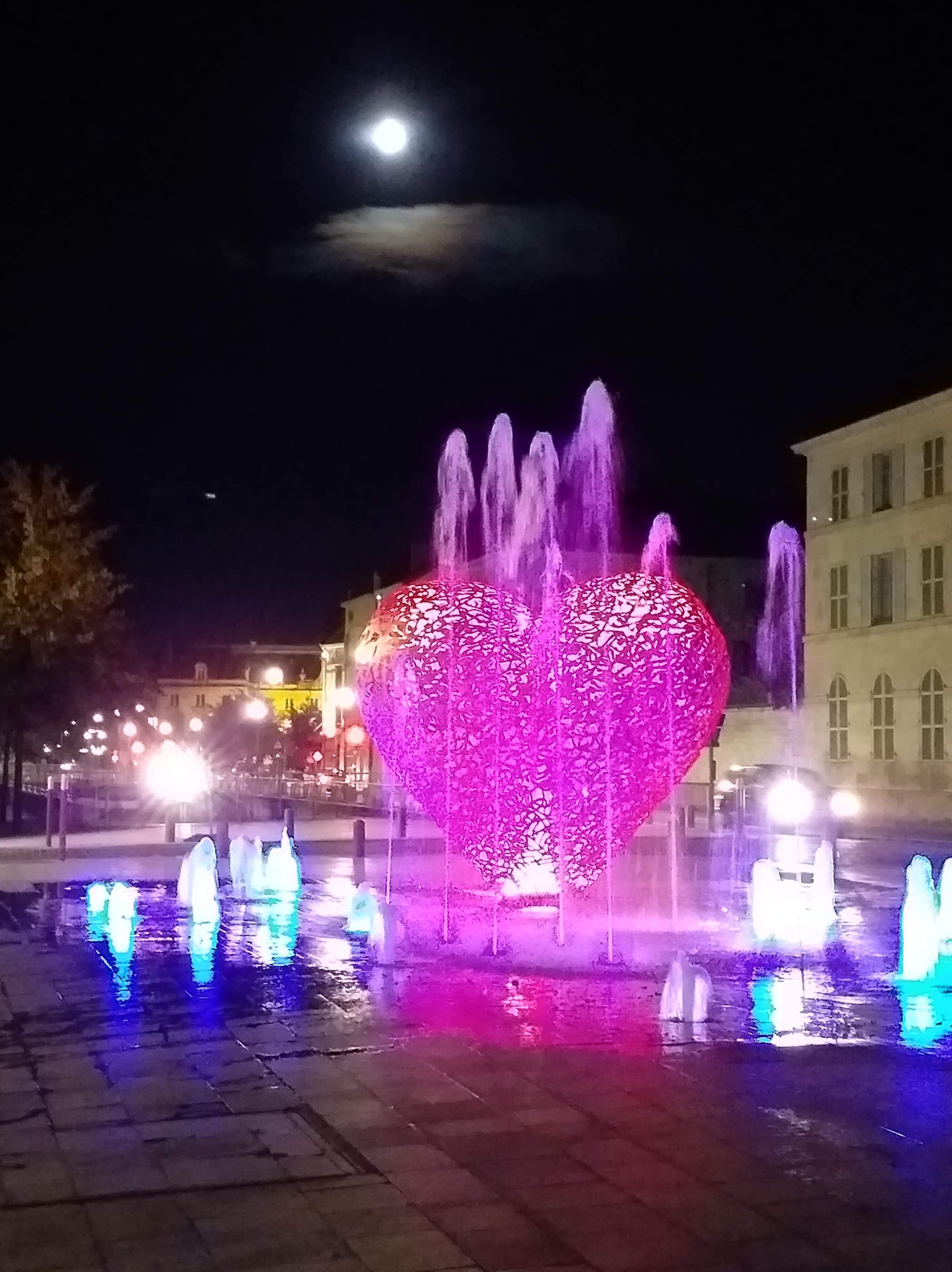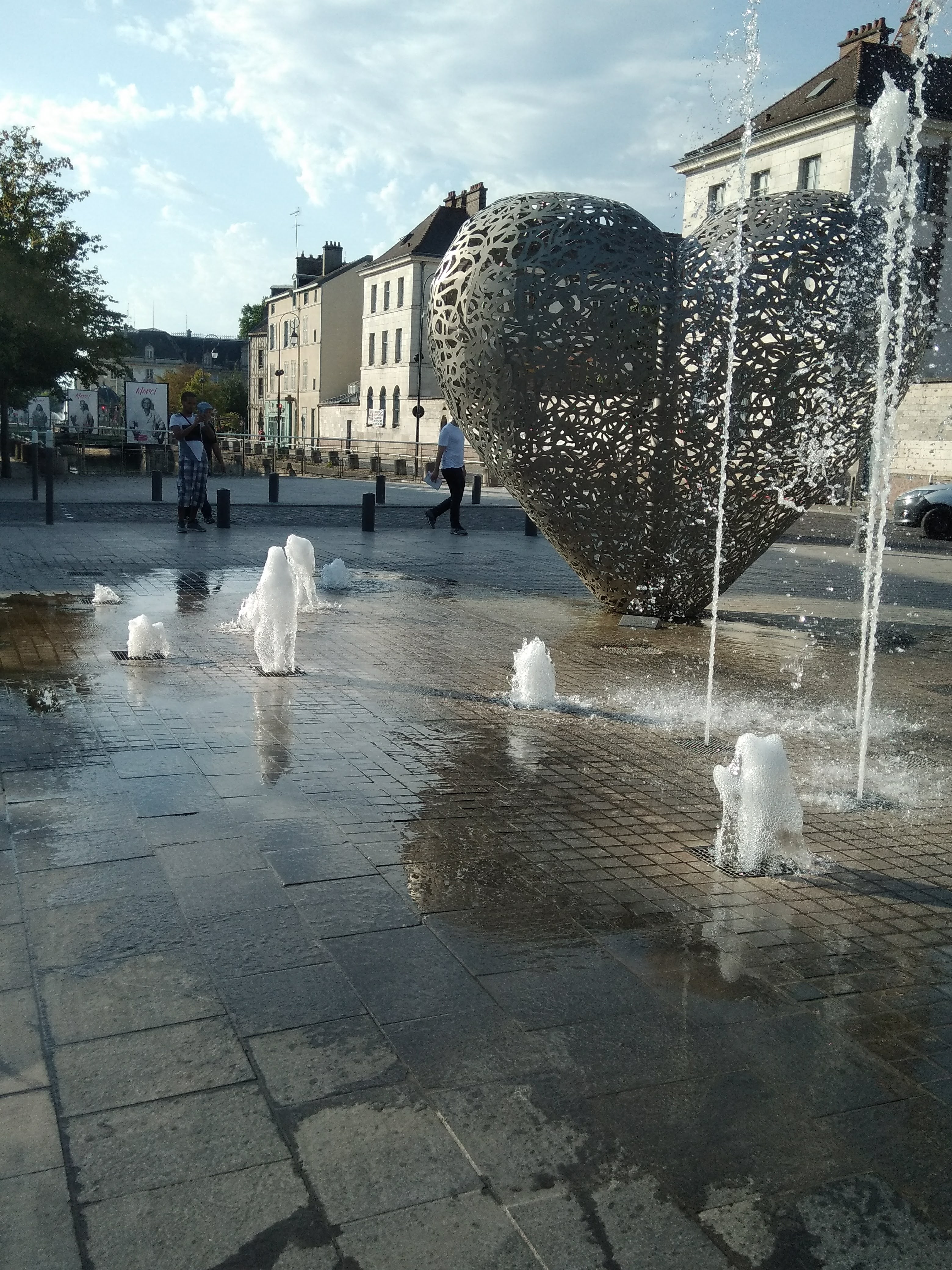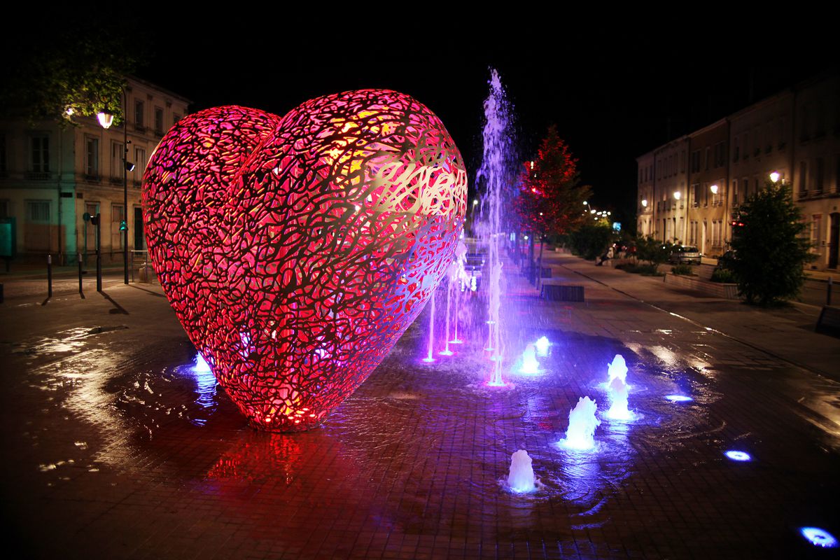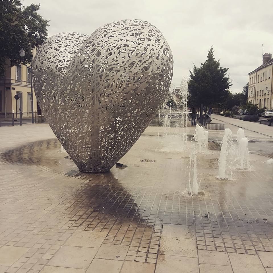Une sculpture vraiment magnifique qui représente bien l'amour. Et les battements du cœur avec cette lumière rouge et ces jets qui sortent de terre. À voir si vous passez par Troyes.