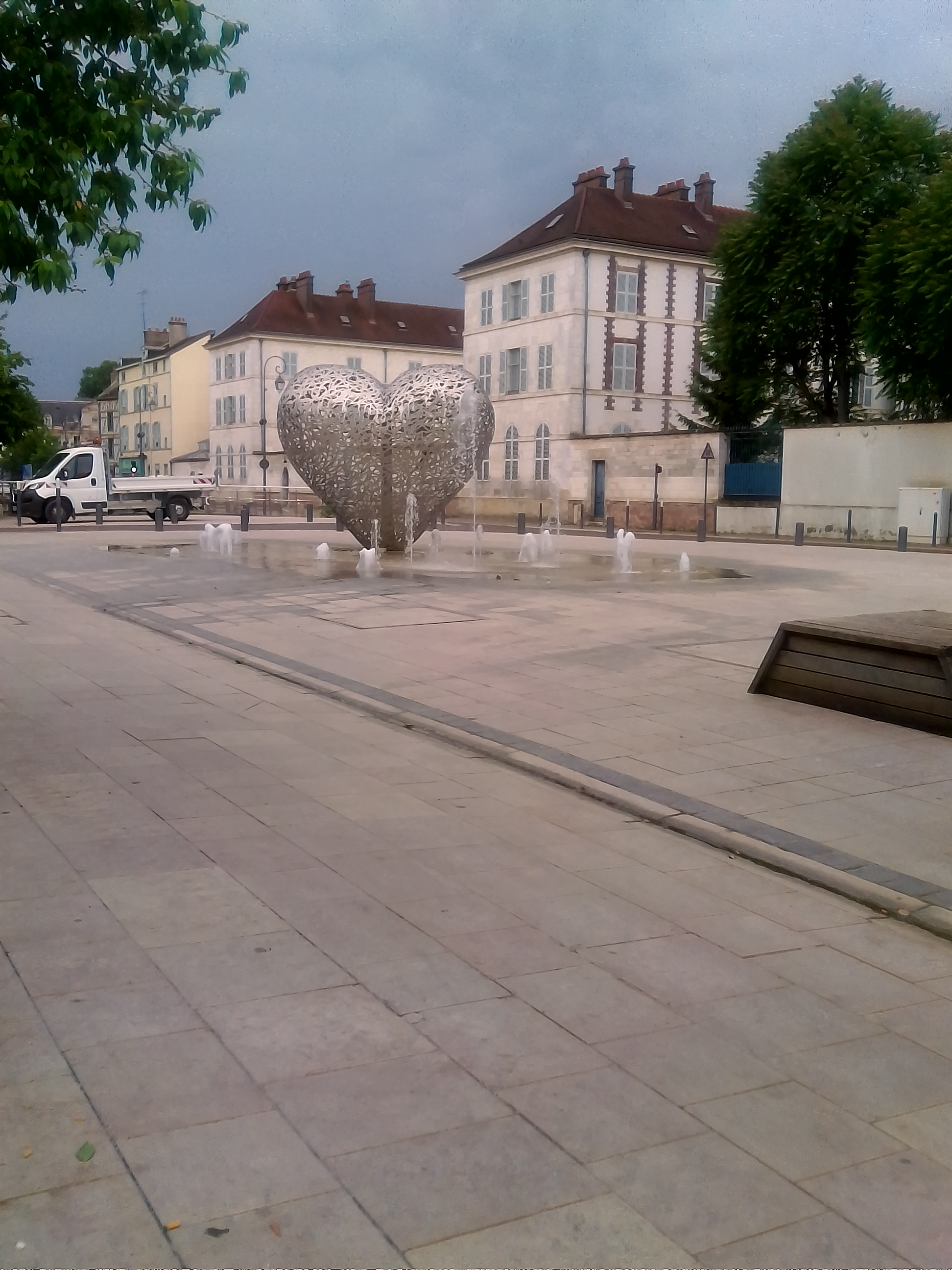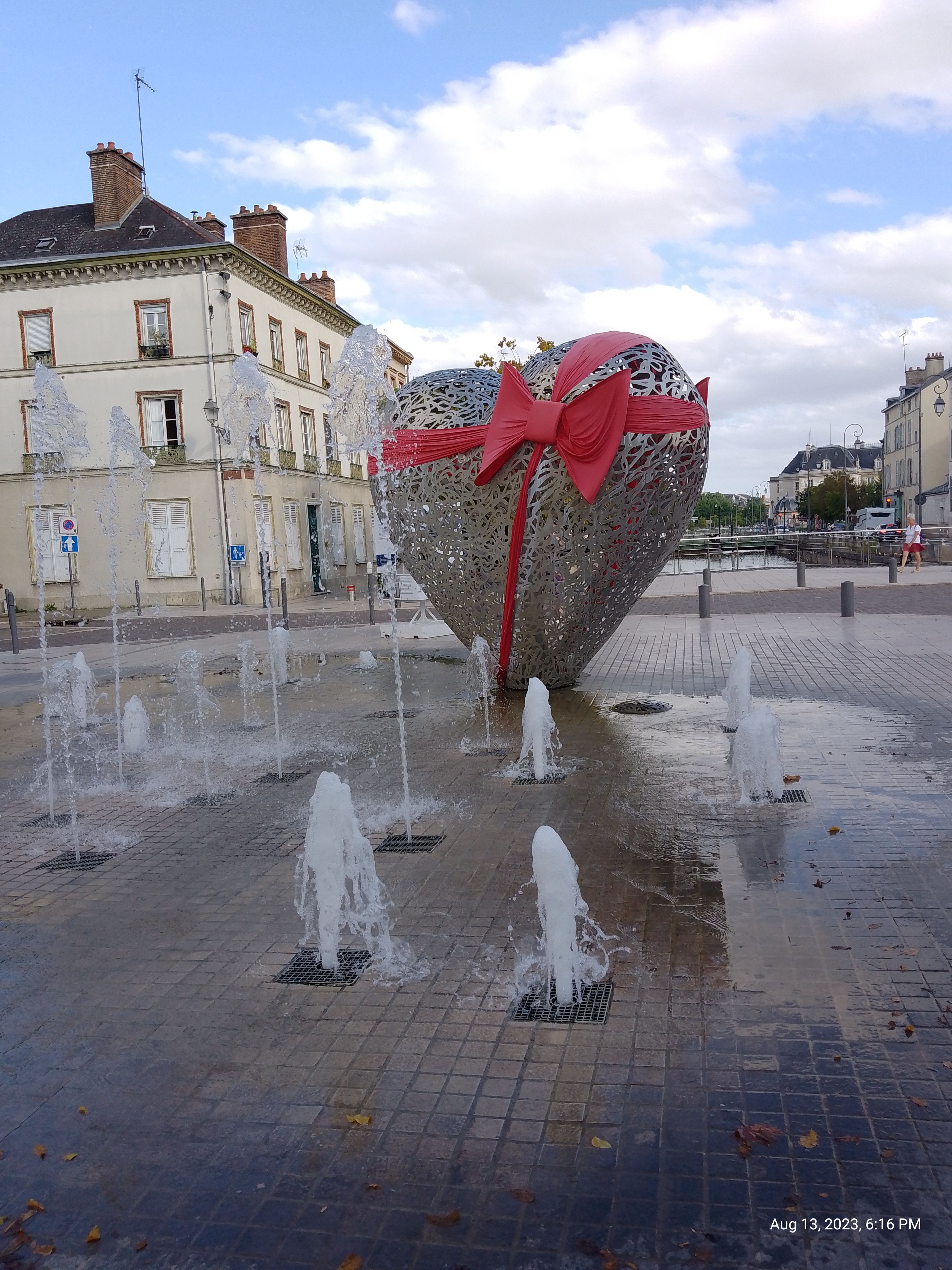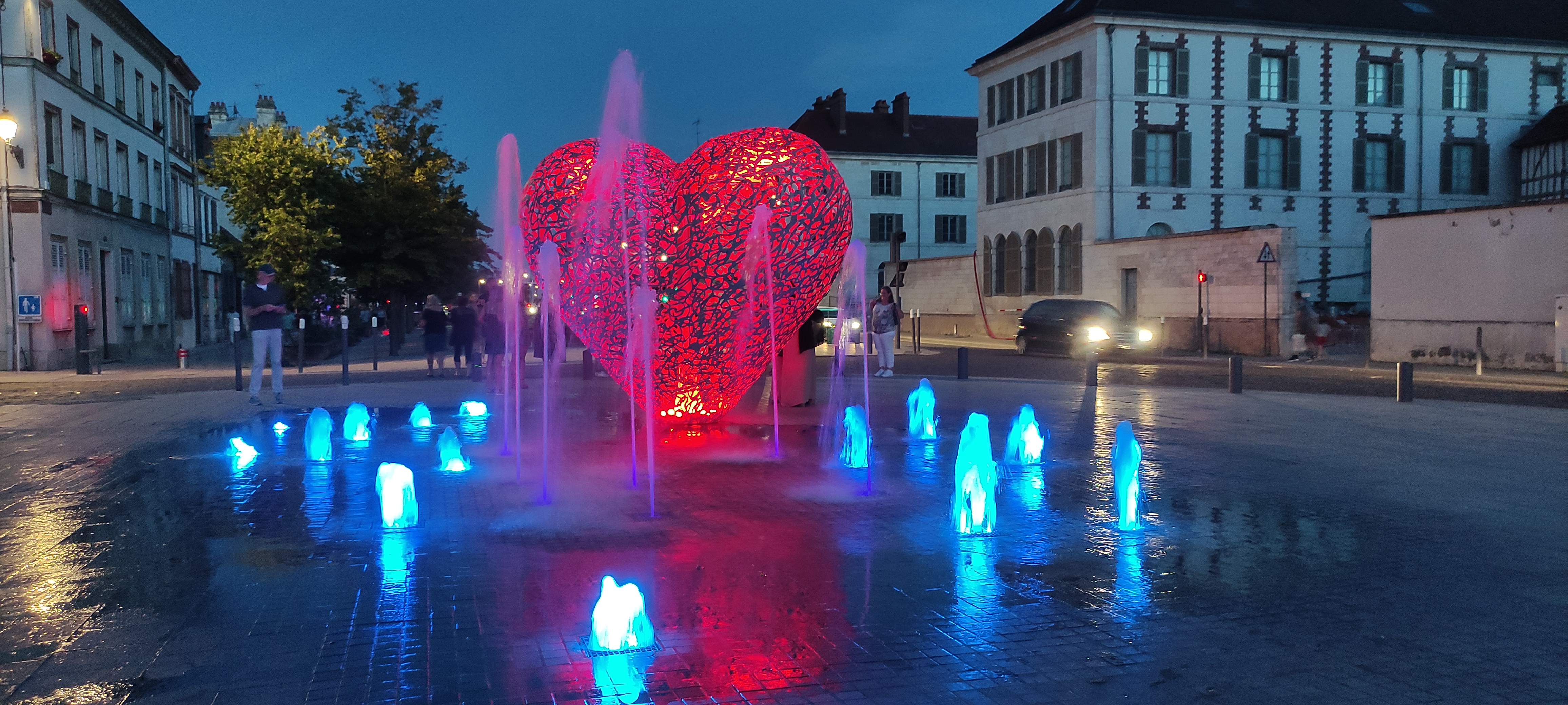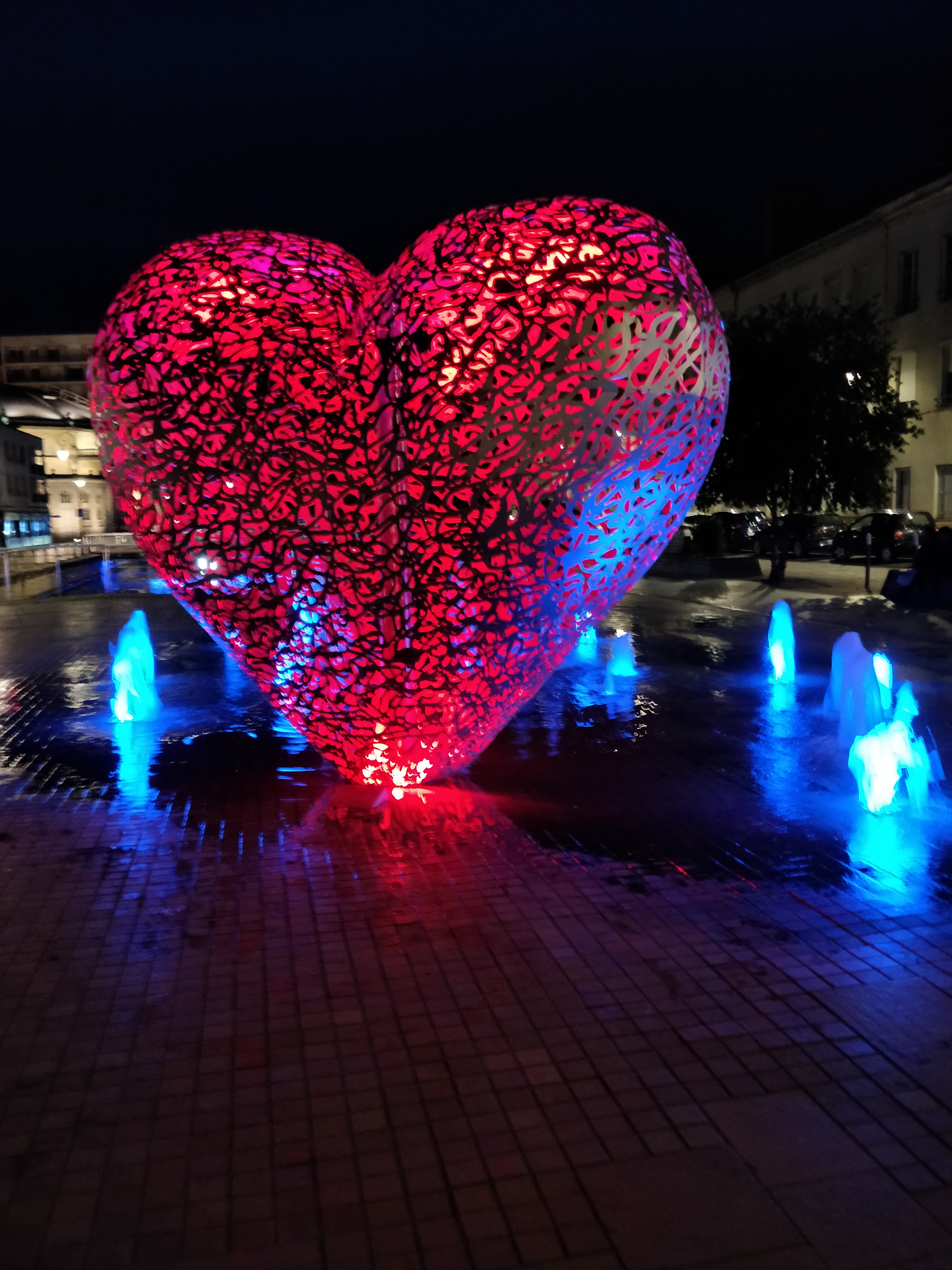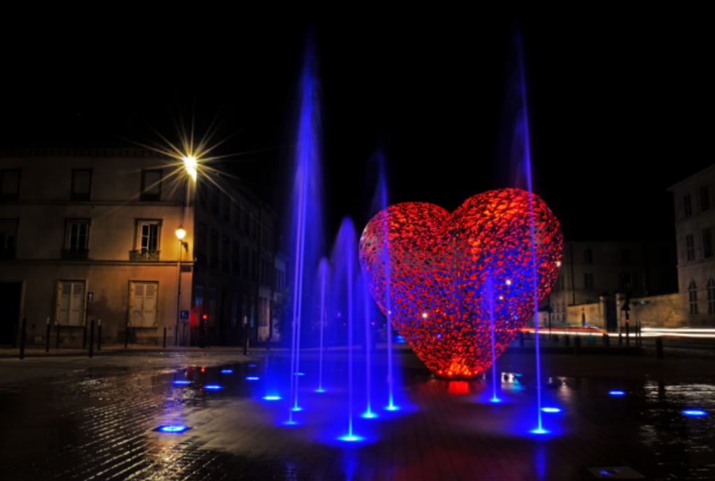 Une sculpture vraiment magnifique qui représente bien l'amour. Et les battements du cœur avec cette lumière rouge et ces jets qui sortent de terre. À voir si vous passez par Troyes.