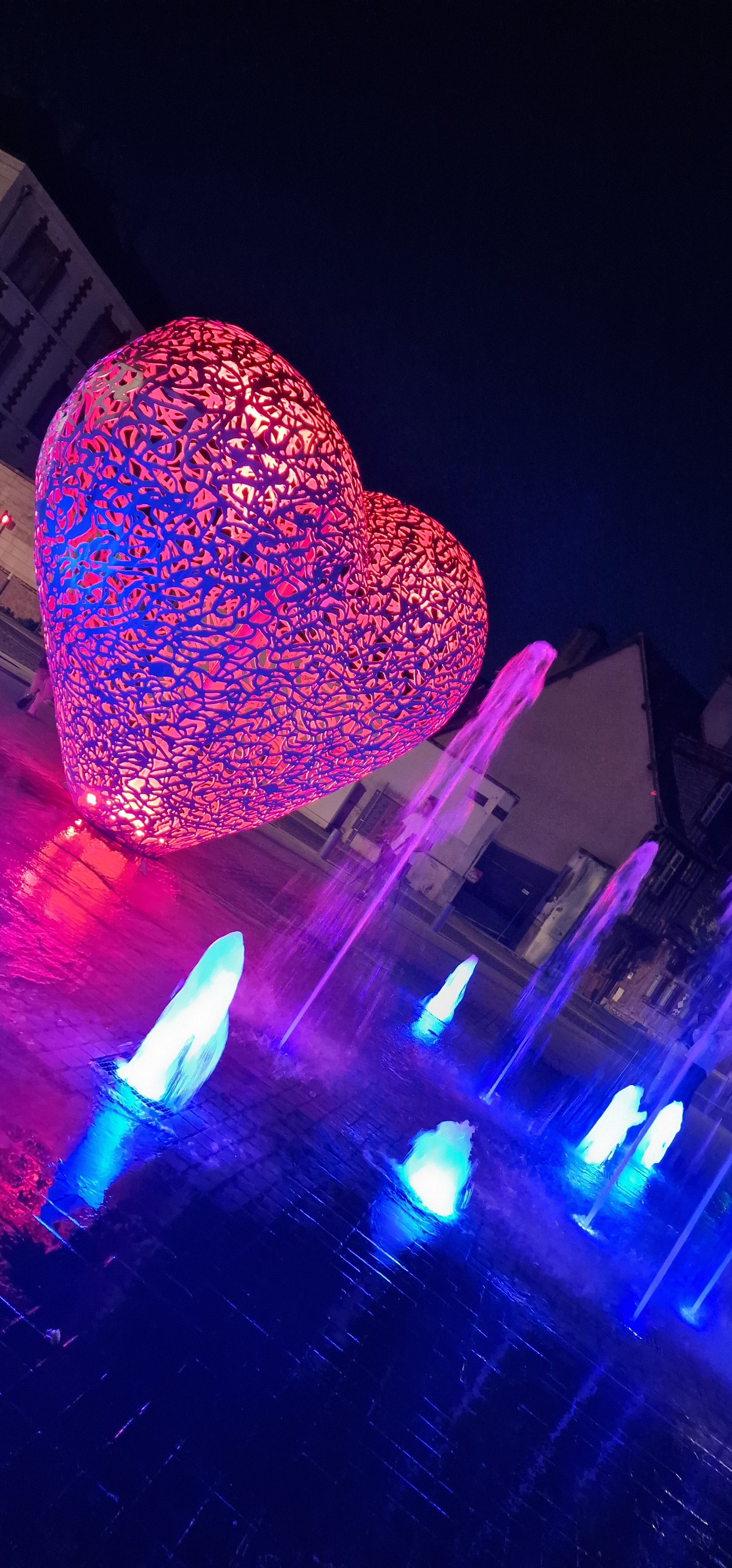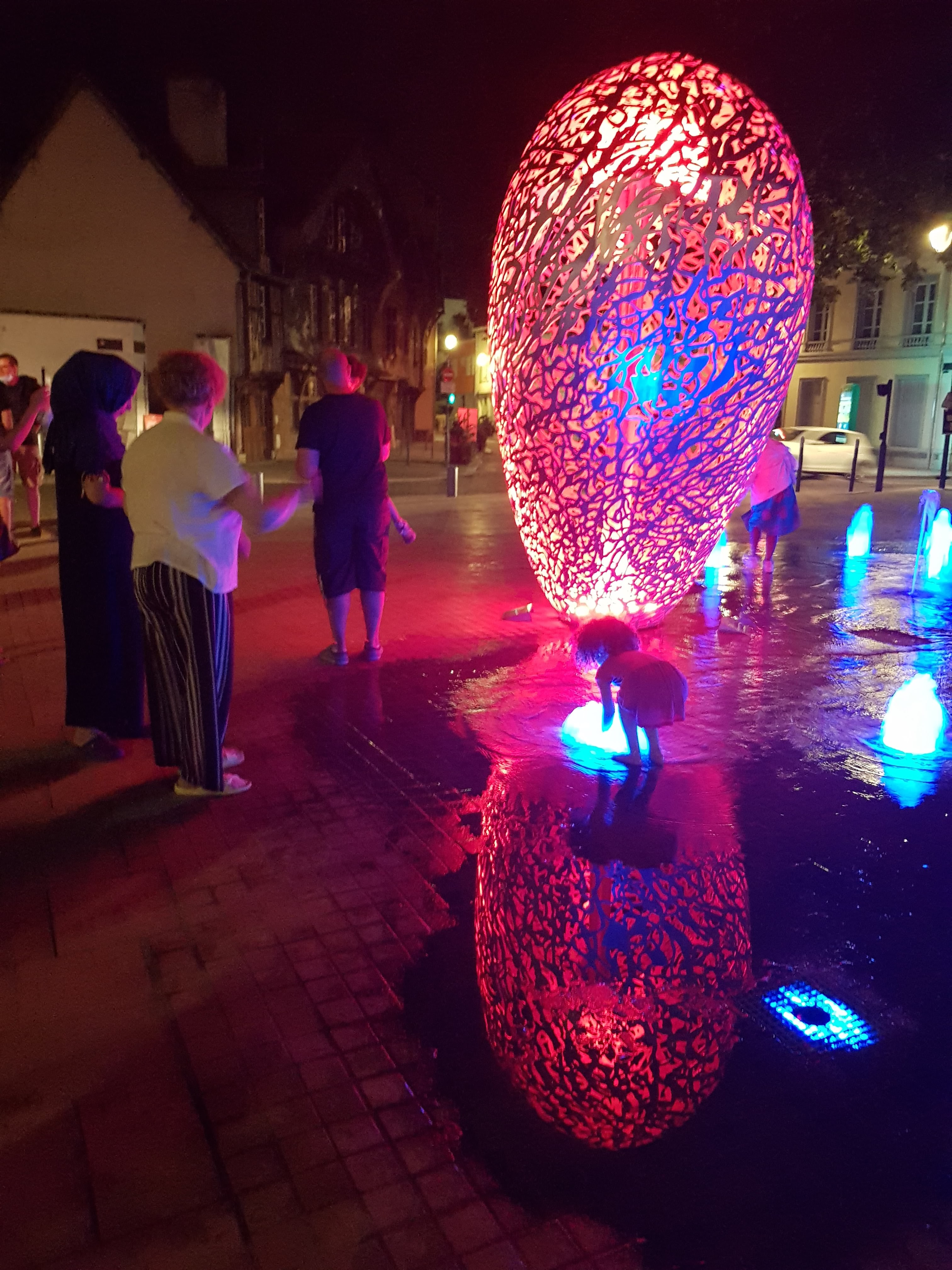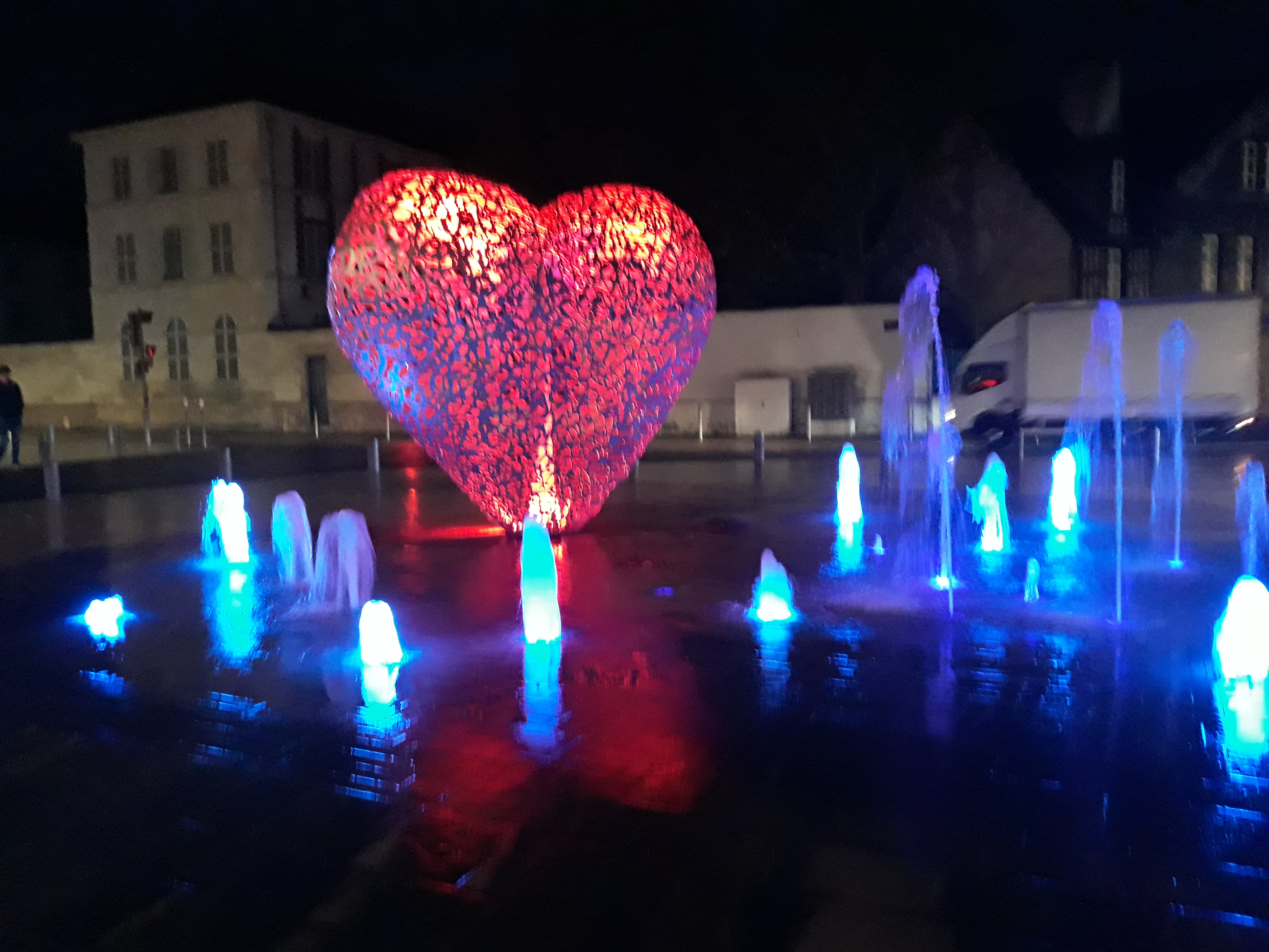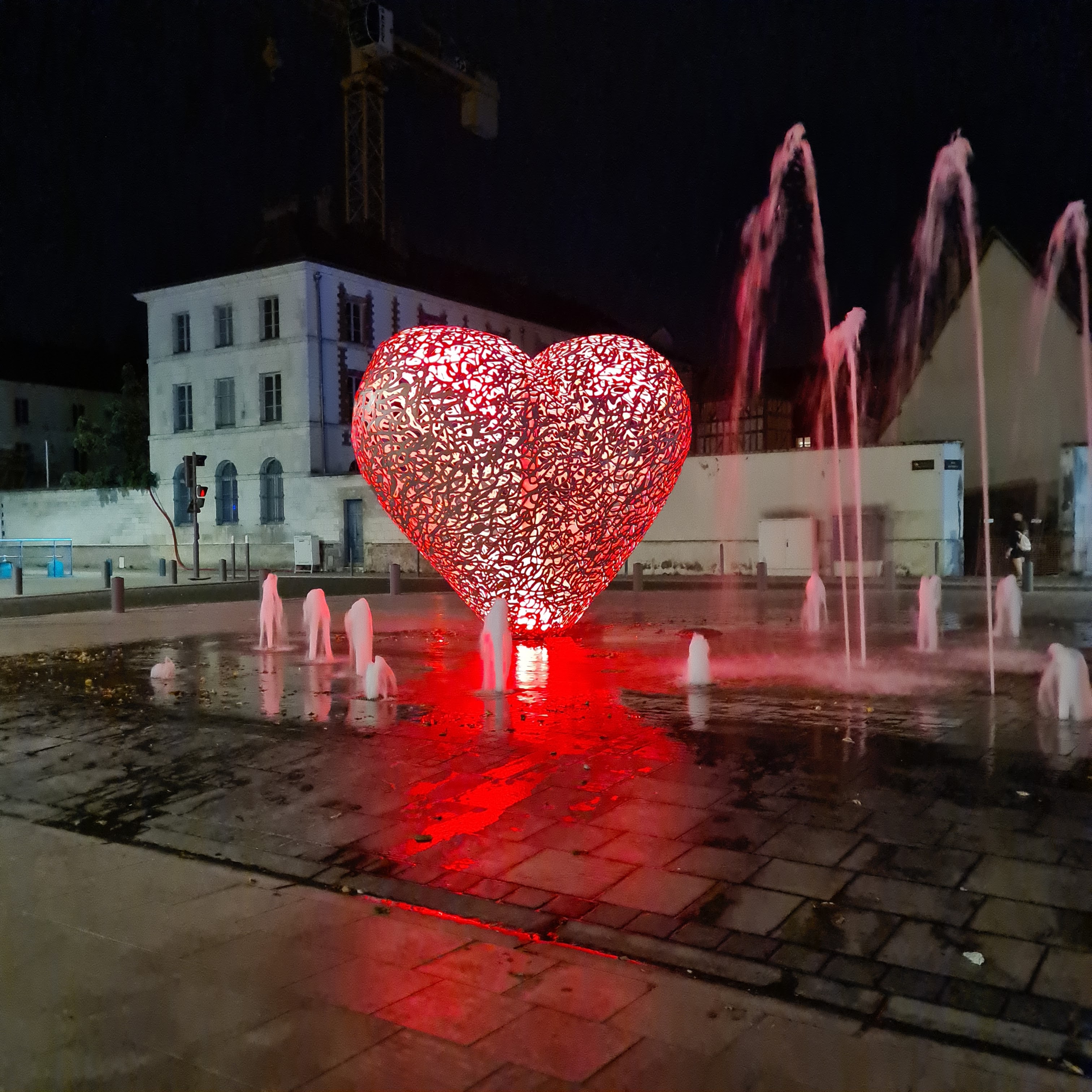 Une sculpture vraiment magnifique qui représente bien l'amour. Et les battements du cœur avec cette lumière rouge et ces jets qui sortent de terre. À voir si vous passez par Troyes.