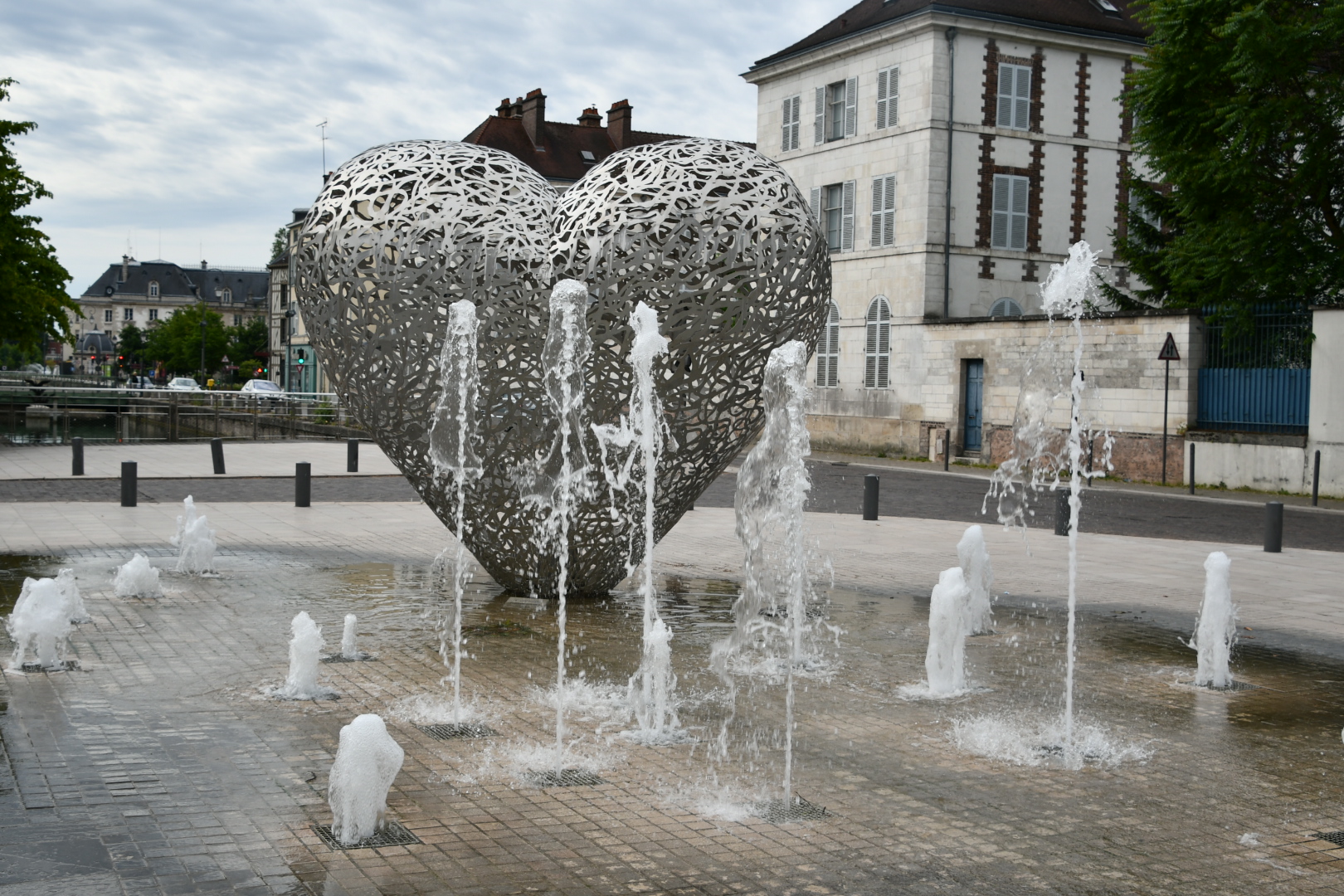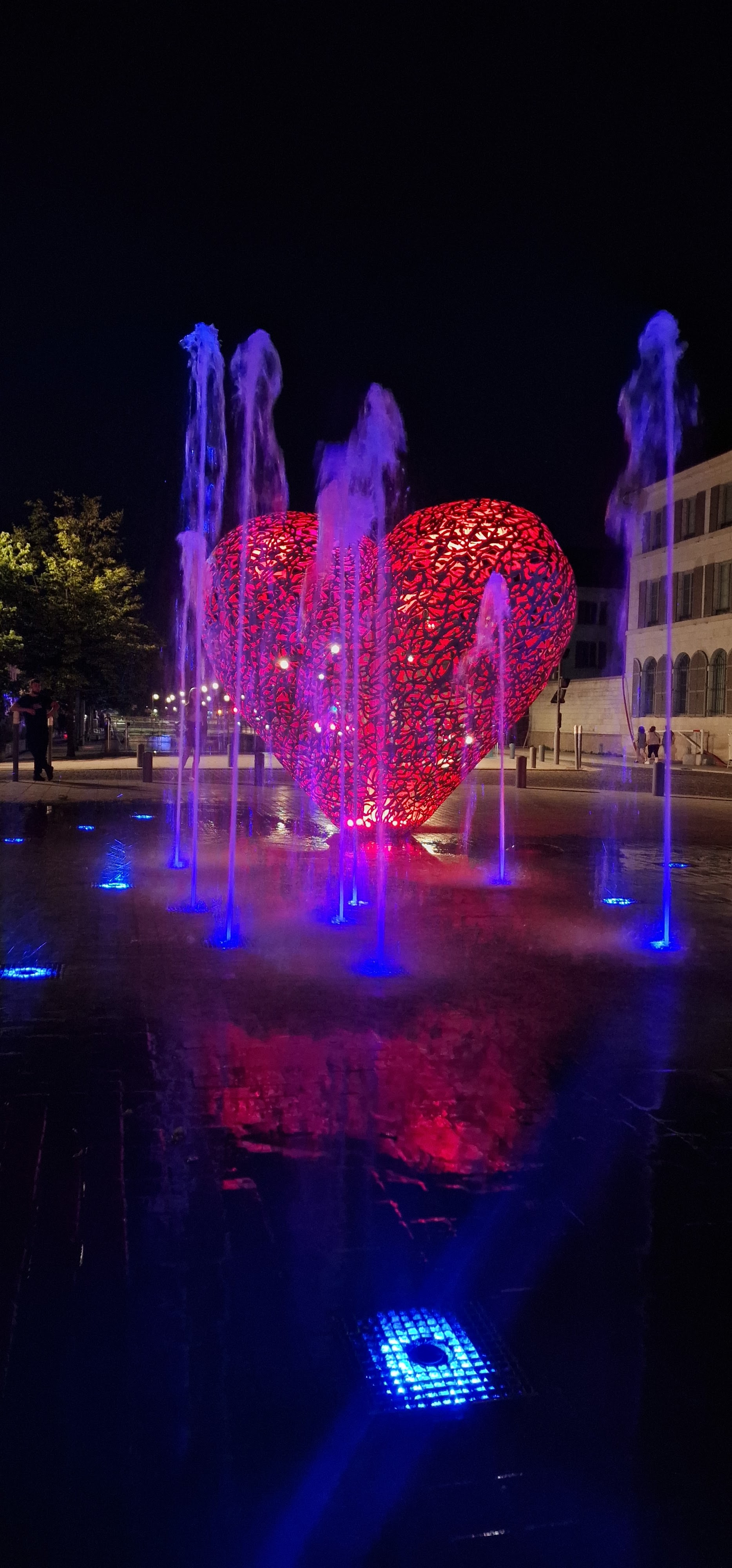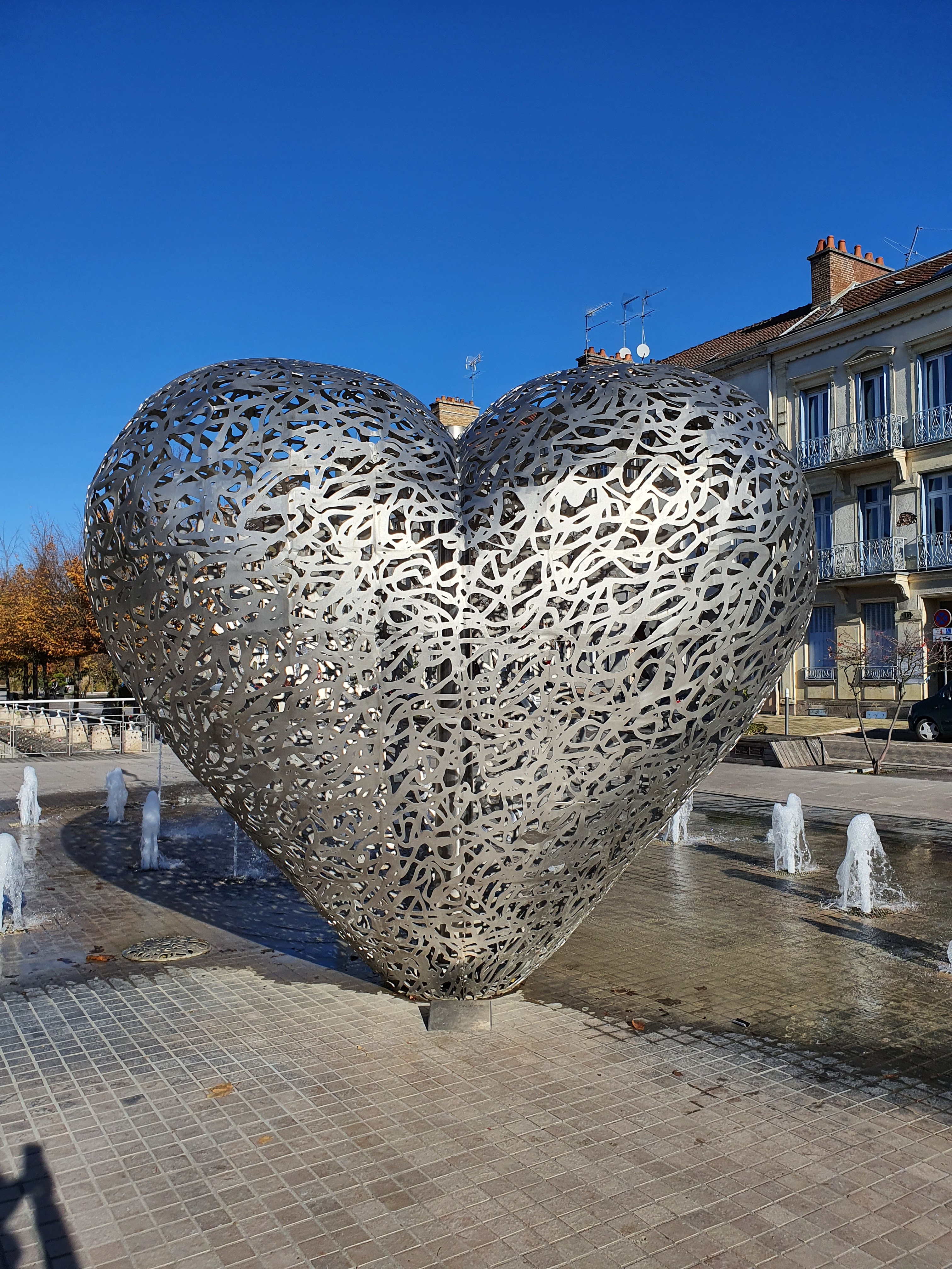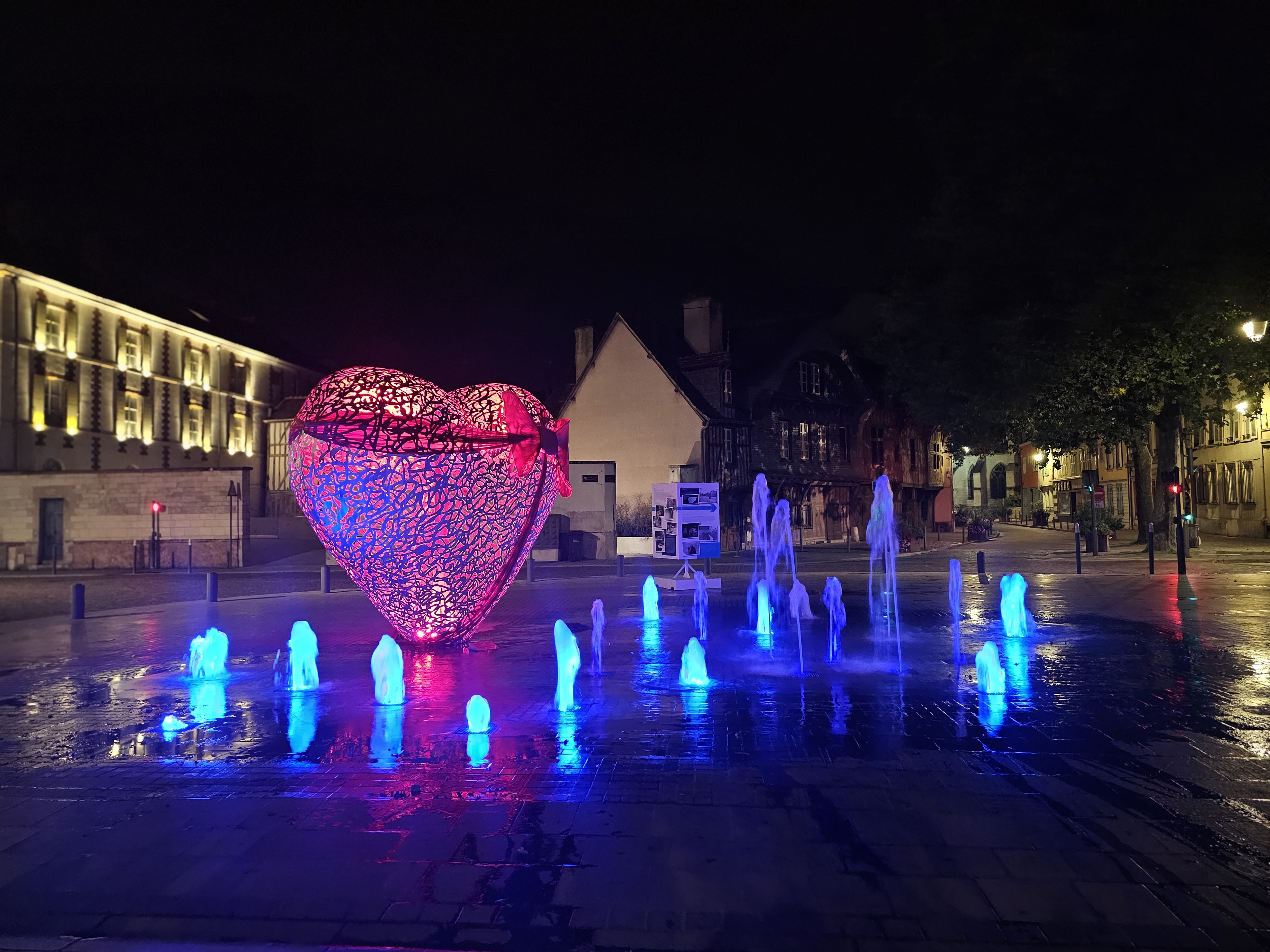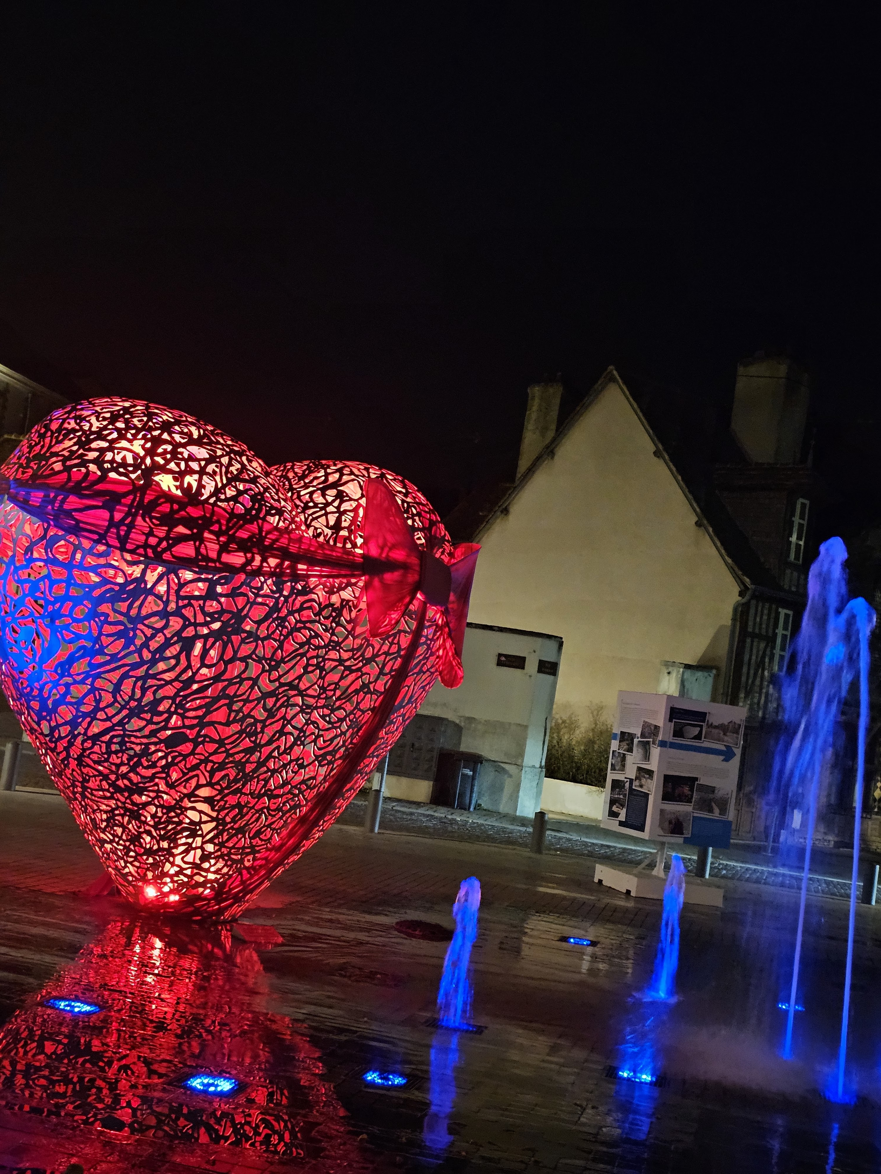 Une sculpture vraiment magnifique qui représente bien l'amour. Et les battements du cœur avec cette lumière rouge et ces jets qui sortent de terre. À voir si vous passez par Troyes.