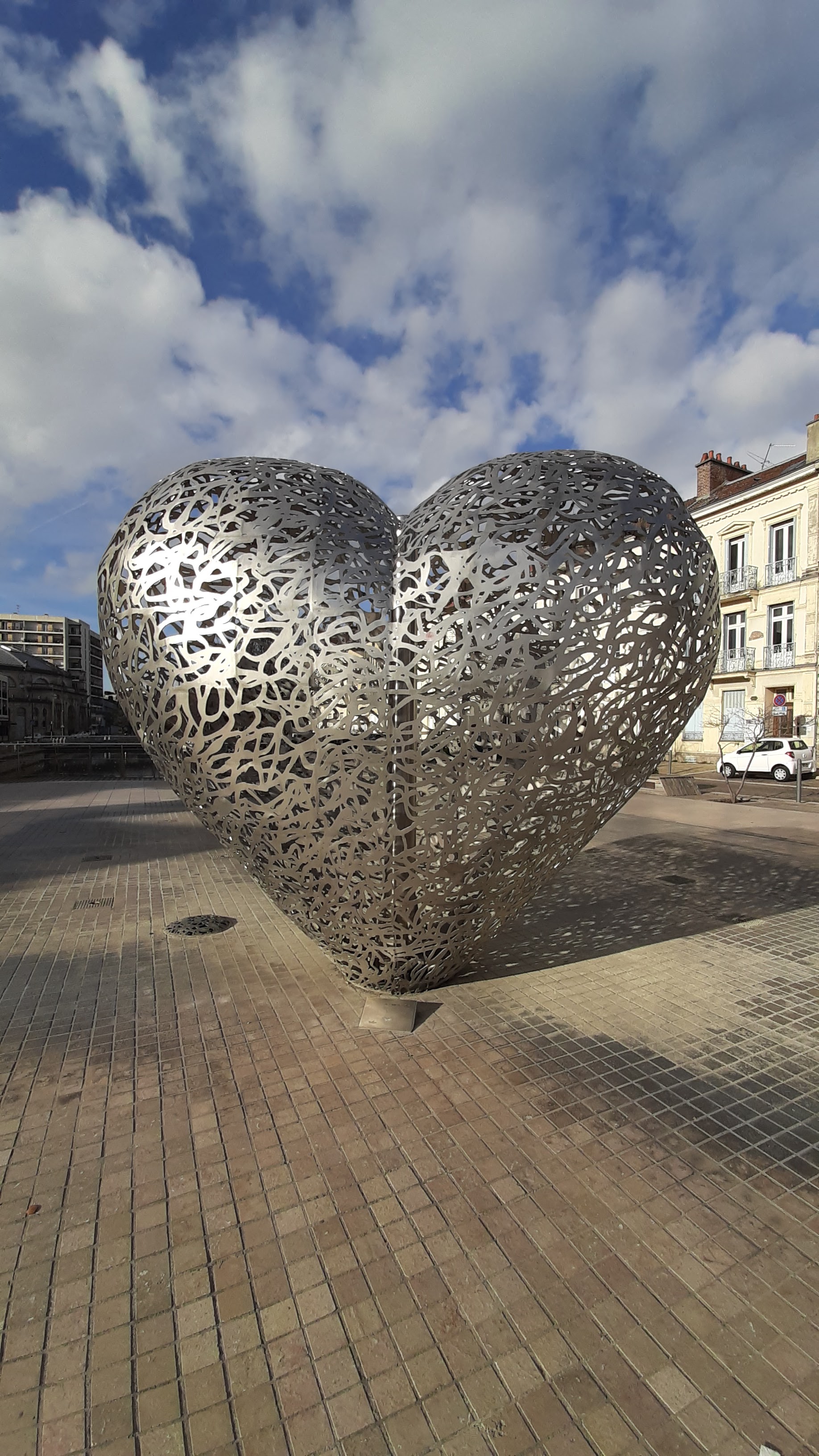 Savoir + !? 🙂(Fr & En) Le Cœur de Troyes Cette sculpture fut créée en 2013 par le couple Michèle et Thierry Kayo-Houël (Caillaud-Houël), elle est constituée de plus de 200 morceaux d'acier inoxydable de 40x40 cm assemblés entre eux. Habillé de lumières rouges, le cœur s'illumine la nuit tombée : une caméra et un programme informatique anime les battements lumineux de l'œuvre à mesure que les spectateurs approchent. -En- The Heart of Troyes This sculpture was created in 2013 by the couple Michèle and Thierry Kayo-Houël (Caillaud-Houël), it is made up of more than 200 pieces of stainless steel of 40x40 cm assembled together. Dressed in red lights, the heart lights up at nightfall: a camera and a computer program animate the luminous beats of the work as the spectators approach.