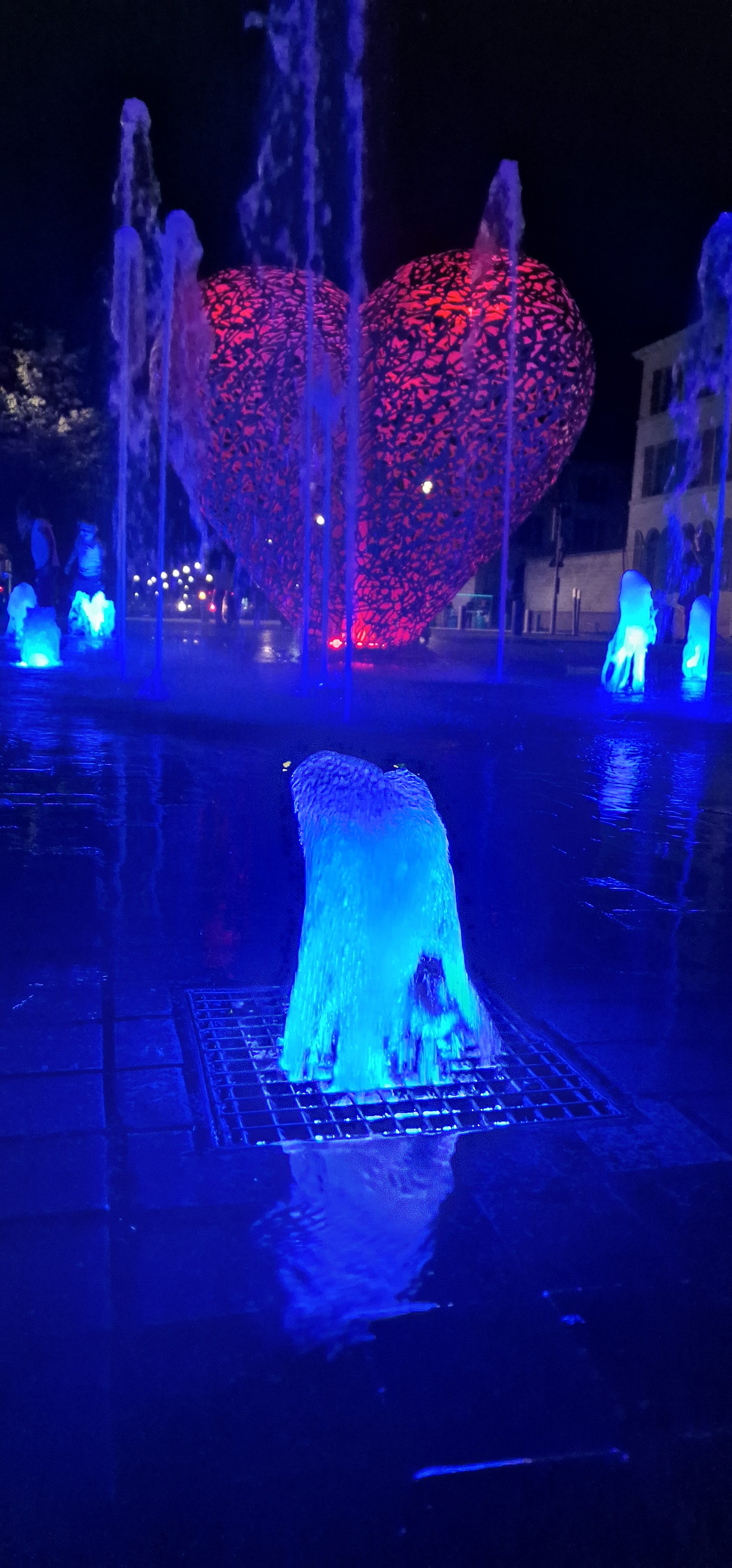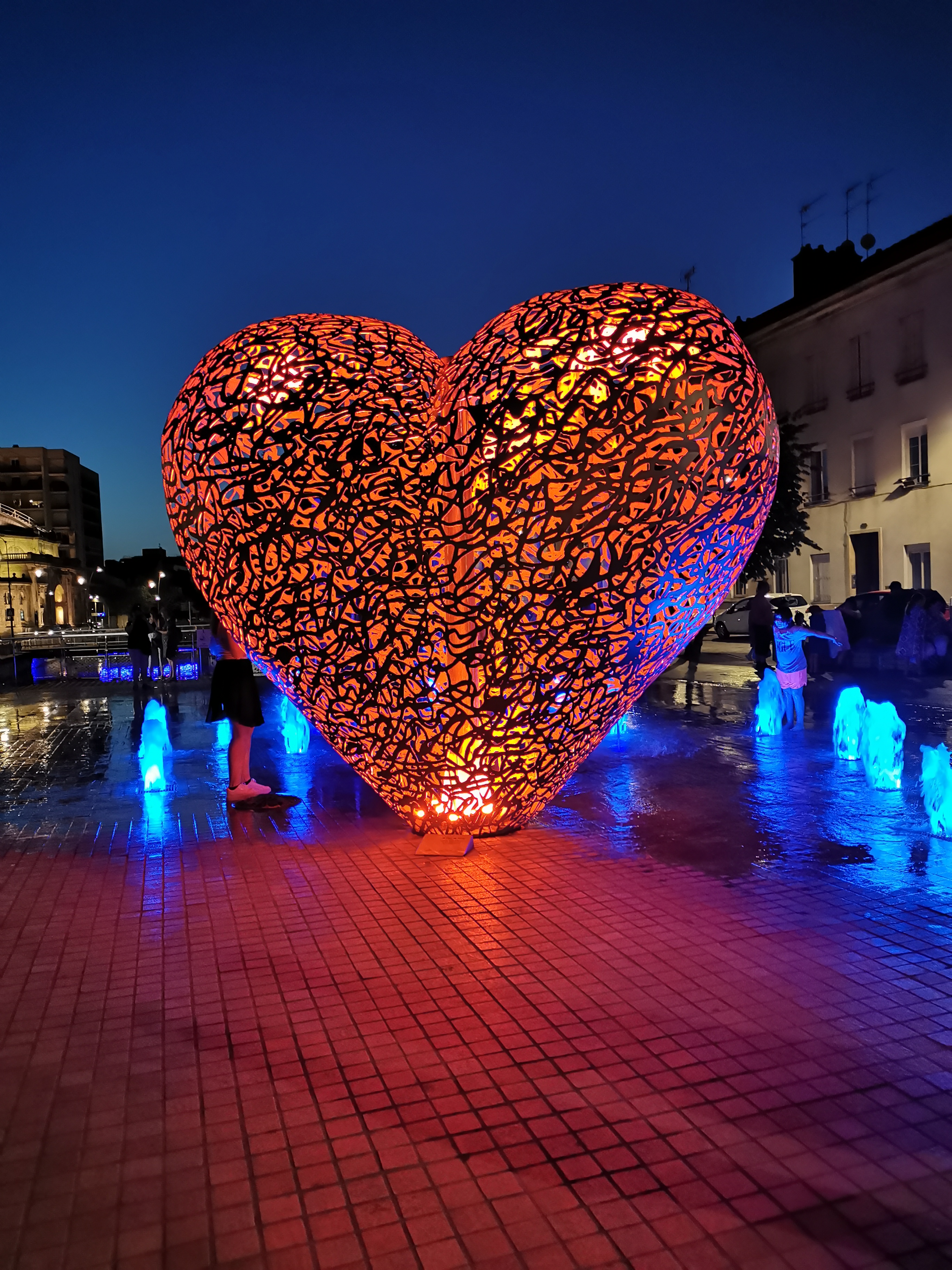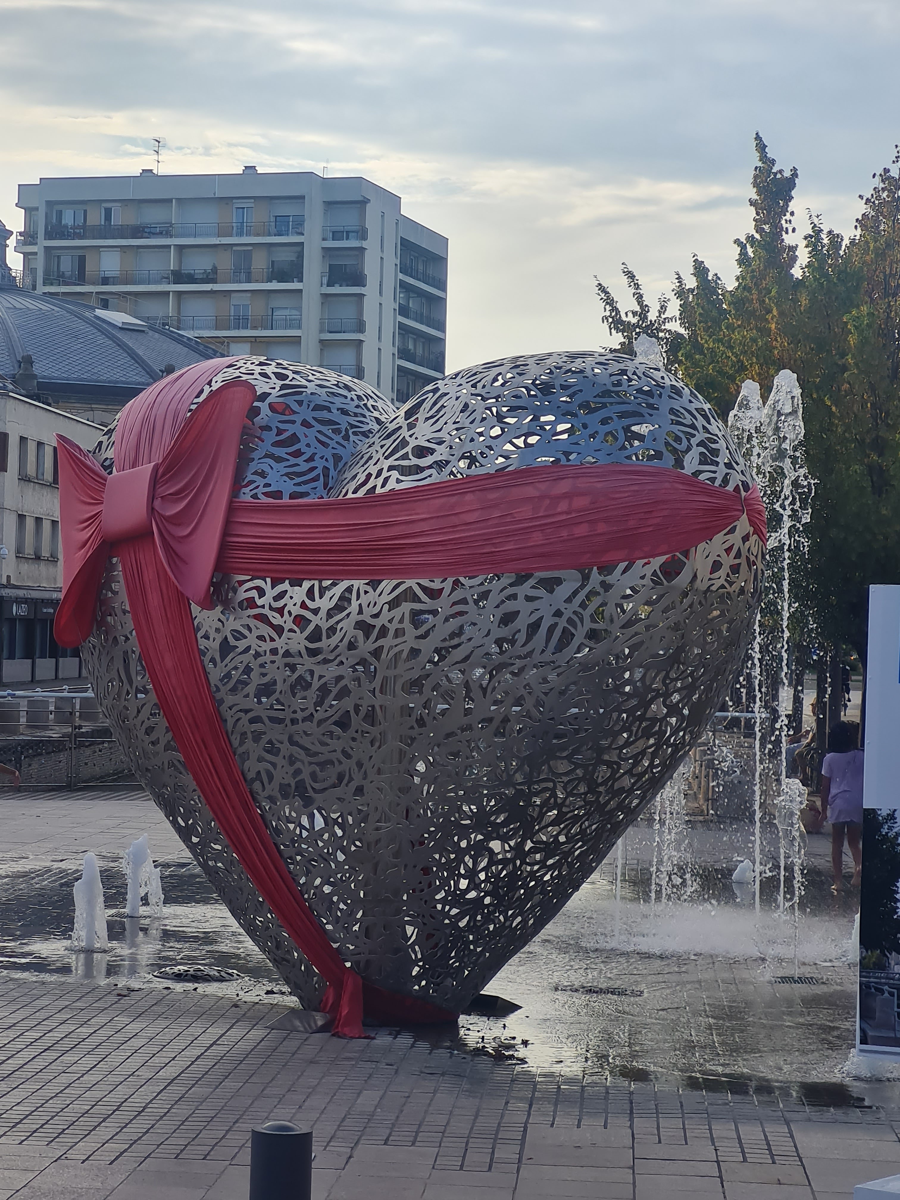 C'est un coeur en métal, le coeur de notre ville et de ceux qui l'aiment il se parre de rouge à la nuit tombée. Entouré de petits jets d'eau ou l'on peut se rafraîchir les pieds si on veut .on peut se poser sur les bancs lire un livre et puis s'y endormir. ..