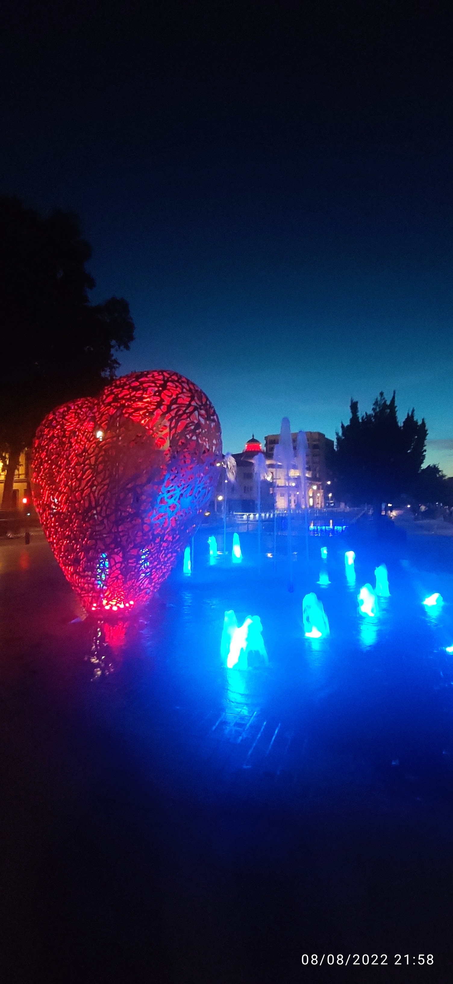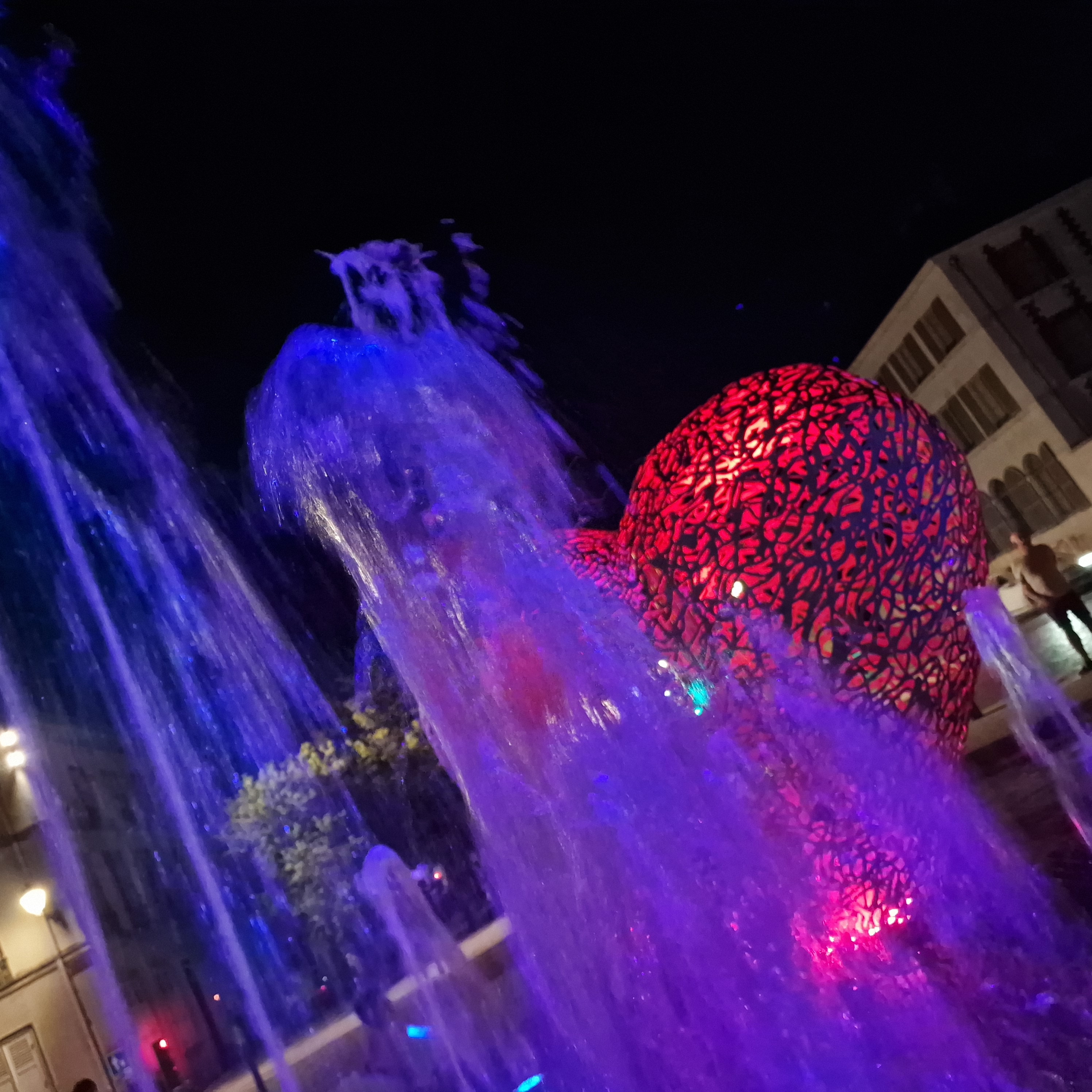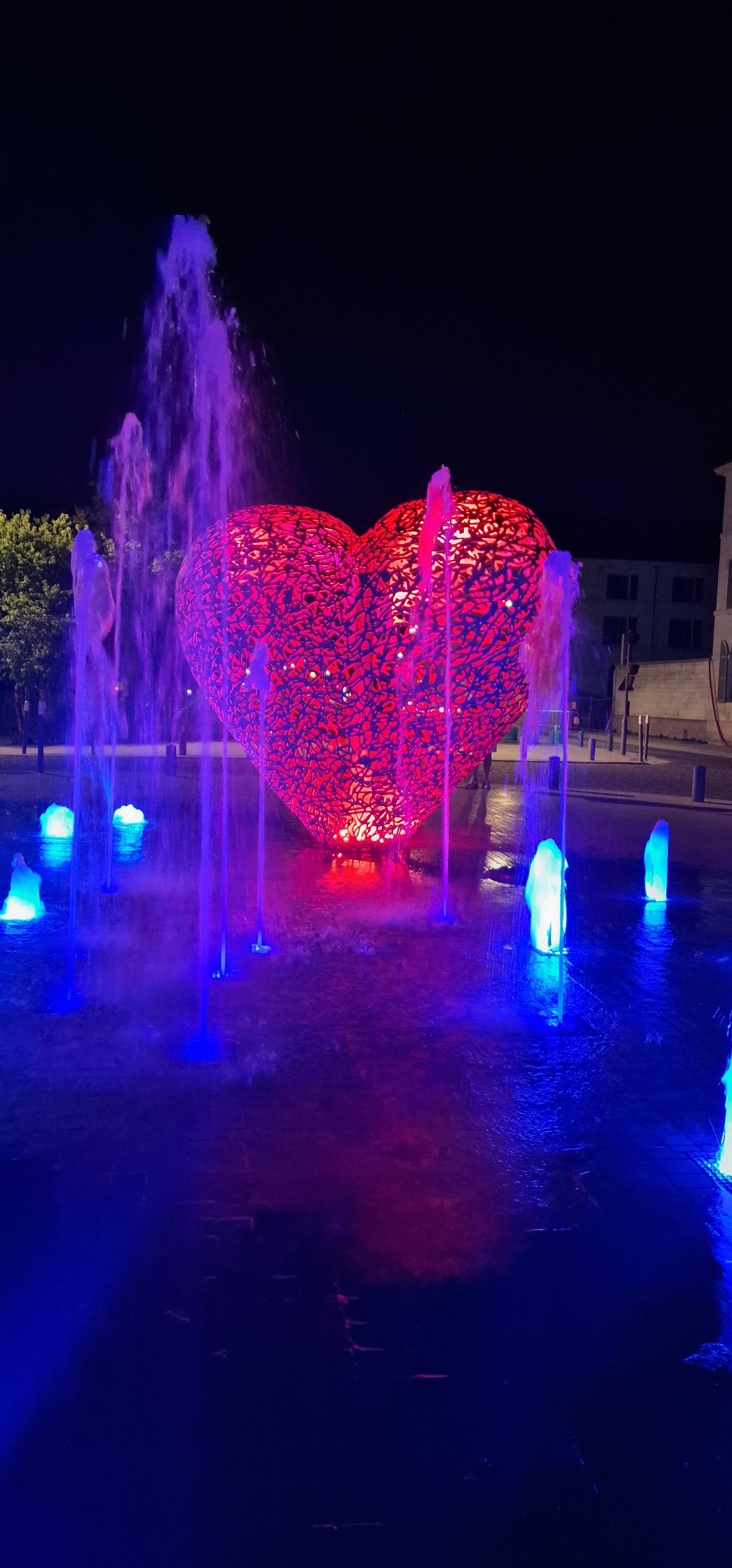 C'est un coeur en métal, le coeur de notre ville et de ceux qui l'aiment il se parre de rouge à la nuit tombée. Entouré de petits jets d'eau ou l'on peut se rafraîchir les pieds si on veut .on peut se poser sur les bancs lire un livre et puis s'y endormir. ..