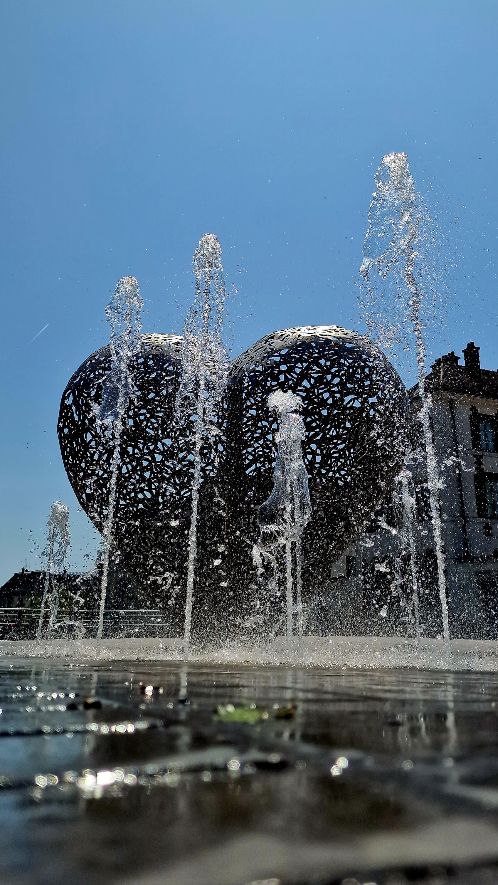 Quel ravissement pour les yeux, j'adore cette fontaine de Cœur placée comme pour insuffler la vie, comme une poésie graphique. L'eau 💦 apporte aussi en élément et effet graphique. L'eau en opposition au métal.. Le Cœur en dentelle de fer est comme un paradoxe, comme une antinomie,.. C'est un plaisir de pouvoir rêvasser ici.. 🕊️🎑💐☀️💕